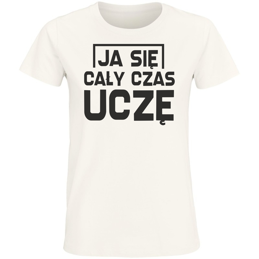 Poznaj koszulkę, która mówi za Ciebie! Minimalistyczny design, inspirowany estetyką vintage i plakatów z lat 20. i 30. XX wieku, sprawia, że ten model jest idealny dla osób ceniących oryginalność i niezobowiązujący humor. Na froncie umieszczono charakterystyczny napis „JA SIĘ CAŁY CZAS UCZĘ”, który z pewnością wywoła uśmiech i pokrętny uśmiech na twarzy przechodniów. Ta koszulka to idealny sposób na wyrażenie swojego poczucia humoru i pokazanie, że ciągłe poznawanie świata jest Twoim stylem życia. Niezależnie od tego, czy jesteś studentem, miłośnikiem nauki, czy po prostu lubisz zabawne akcenty w ubiorze, ta koszulka będzie Twoim ulubionym elementem garderoby. Postaw na wygodę i styl z naszym nowym modelem! Idealna na co dzień, na spotkania ze znajomymi, na kawę z ulubioną książką, a nawet na luźne wyjście do kina. Ta koszulka stanie się Twoim must-have.