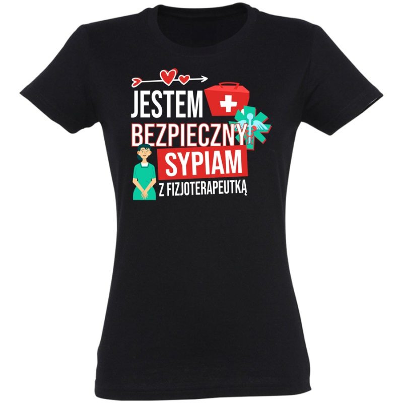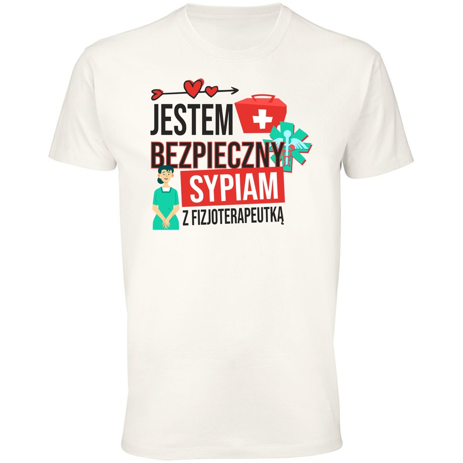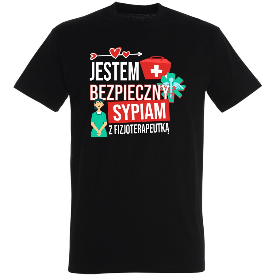 Pokaż wszystkim, że jesteś bezpieczny i wiesz na co się pisze! Ta koszulka to idealny sposób, by wyrazić swoje pozytywne nastawienie i poczucie humoru – szczególnie jeśli jesteś w branży medycznej. Grafika łączy w sobie nowoczesny styl z nutą retro, a zabawny napis „Jestem bezpieczny, sypiam z fizjoterapeutką” z pewnością rozbawi każdego, kto na nią spojrzy. Dodatkowy element w postaci rysunku fizjoterapeuty i strzałka na dole nadaje całości charakteru i podkreśla tematykę. Wyraź swój styl i poczucie humoru z naszą nową koszulką! Idealna dla fizjoterapeutek, studentów fizjoterapii i wszystkich, którzy cenią sobie wygodę i zabawę. Niezawodna w pracy i na co dzień, ta koszulka to must-have dla każdego z poczuciem humoru. Poczuj się pewnie i komfortowo, a Twoje pozytywne nastawienie z pewnością zainspiruje innych! Dodaj odrobinę lekkości do swojej garderoby i pokaż światu, że lubisz się śmiać! Ta koszulka to doskonały prezent dla bliskiej Ci osoby pracującej w branży medycznej lub dla Ciebie, jeśli chcesz dodać sobie trochę energii.