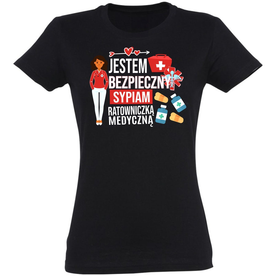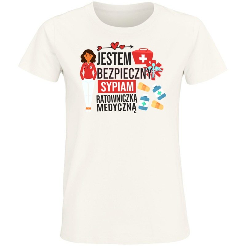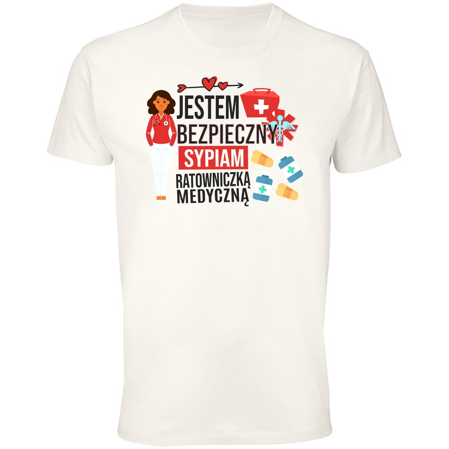Pokaż wszystkim, że jesteś gotowy na akcję! Ta koszulka to idealny sposób na wyrażenie swojego zawodu i poczucia humoru. Grafika łączy w sobie urok i lekkość, przedstawiając sympatyczną ratowniczkę medyczną z uśmiechem na twarzy i mnóstwem potrzebnych akcesoriów. Odważny napis „Jestem Bezpieczny” i „Sypiam Ratowniczką Medyczną” to doskonały sposób na zwrócenie na siebie uwagi i rozluźnienie atmosfery podczas wymagającego dnia pracy. Koszulka idealnie sprawdzi się dla ratowników medycznych, pielęgniarek i wszystkich, którzy chcą dodać odrobinę pozytywnej energii do swojej codzienności. Podaruj sobie lub bliskiemu człowiekowi ten wyjątkowy prezent, który będzie nie tylko stylowy, ale i funkcjonalny. Poczuj się pewnie i komfortowo, wiedząc, że wyglądasz świetnie i pokazujesz światu swoje powołanie z pasją! Ta koszulka to idealny sposób na wyrażenie swojego poczucia humoru i zawodowej tożsamości.