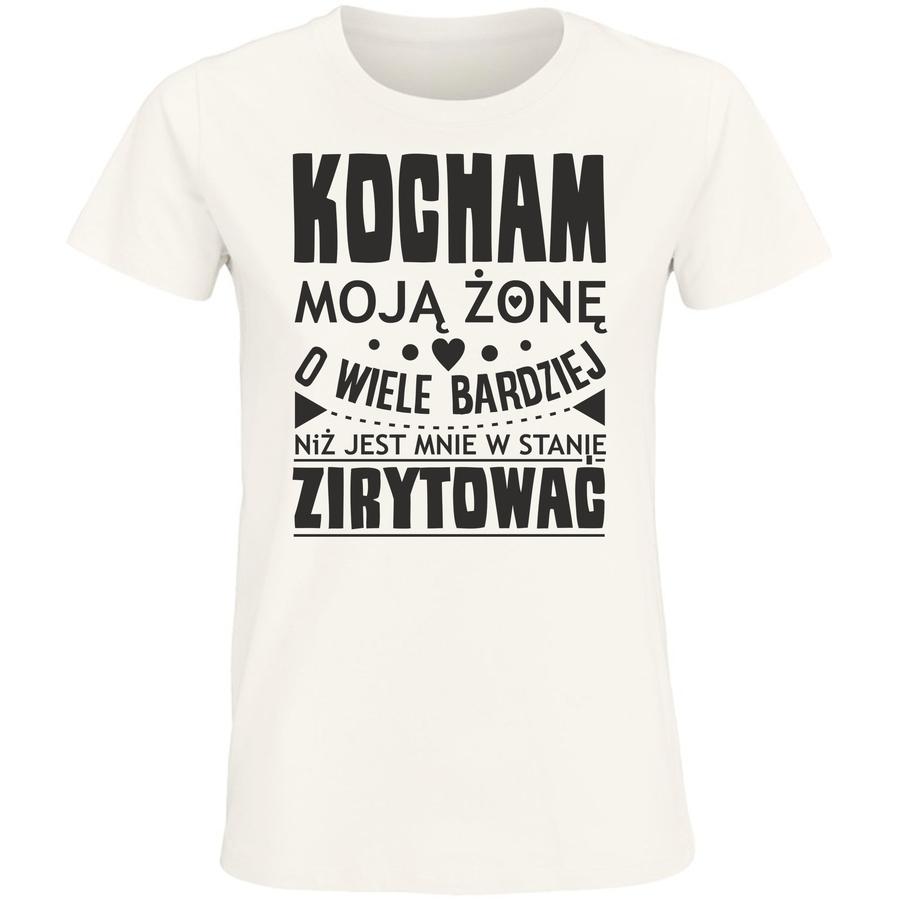 Pokaż światu, jak bardzo kochasz swoją żonę! Ta wyjątkowa koszulka to idealny prezent dla niego, dla niej, dla Was! Styl grafiki nawiązuje do retro plakatów, z charakterystycznymi, lekko krzywymi napisami i urokliwymi sercami. „KOCHAM MOJĄ ŻONĘ O WIELE BARDZIEJ NIŻ JEST MNIE W STANIE ZIRYTOWAĆ” – to odważne, zabawne i pełne miłości wyznanie, które z pewnością rozbawi i wzruszy. Ta koszulka to nie tylko garderoba – to manifestacja miłości, która nie zna granic! Wyraź swoje uczucia w najbardziej oryginalny i niezapomniany sposób. Idealna na Walentynki, rocznicę ślubu, urodziny lub po prostu na dobry humor. Zaskocz swoją ukochaną wyjątkowym prezentem, który będzie przypominał o Waszej niezwykłej więzi. Ta koszulka to doskonały sposób, aby pokazać, jak bardzo ją cenisz i kochasz. Bądź odważny, bądź szczery i wyraź swoje uczucia z dumą! Ta koszulka to idealny sposób na zrobienie komuś niezapomnianej radości.