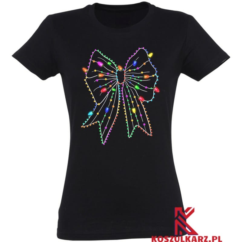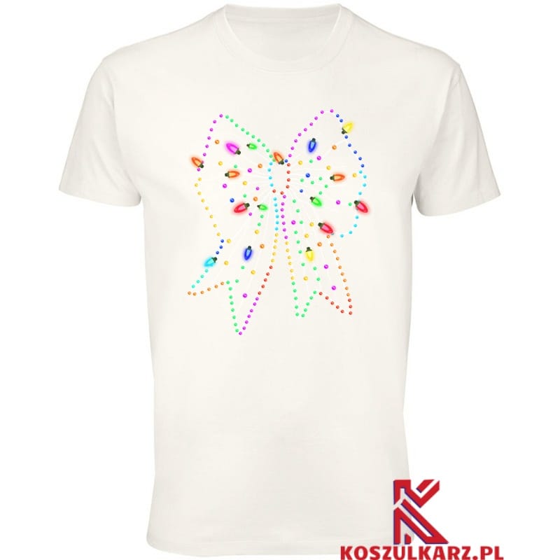 Świąteczny blask w kolorowej kokardzie – Ta koszulka przedstawia dużą, elegancką Kokarda Świąteczna zdobioną kolorowymi światłami, które przypominają te na choinkach. Jest to idealny wybór dla tych, którzy chcą wnieść trochę świątecznego blasku i koloru do swojego ubioru.