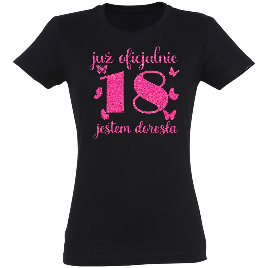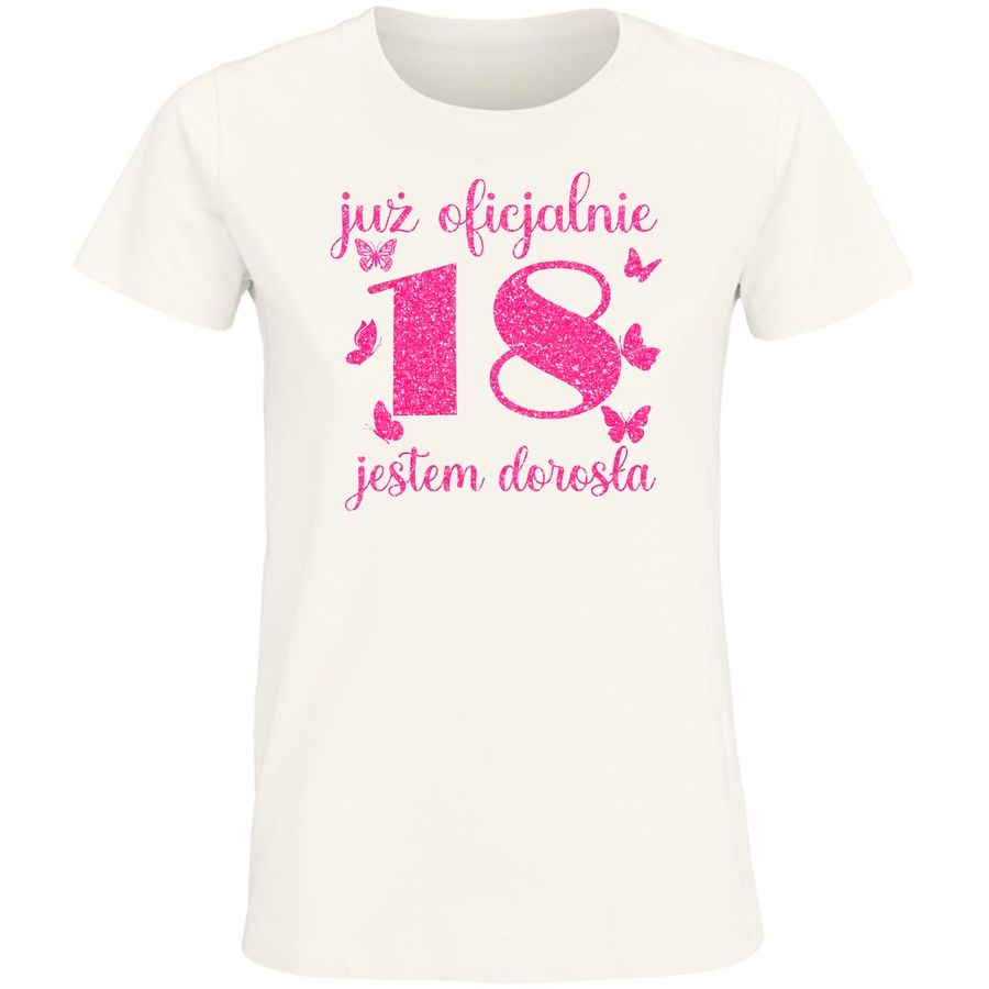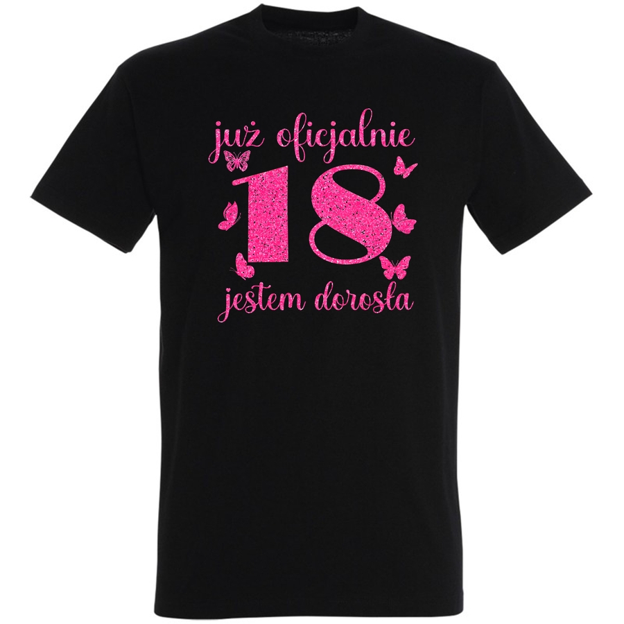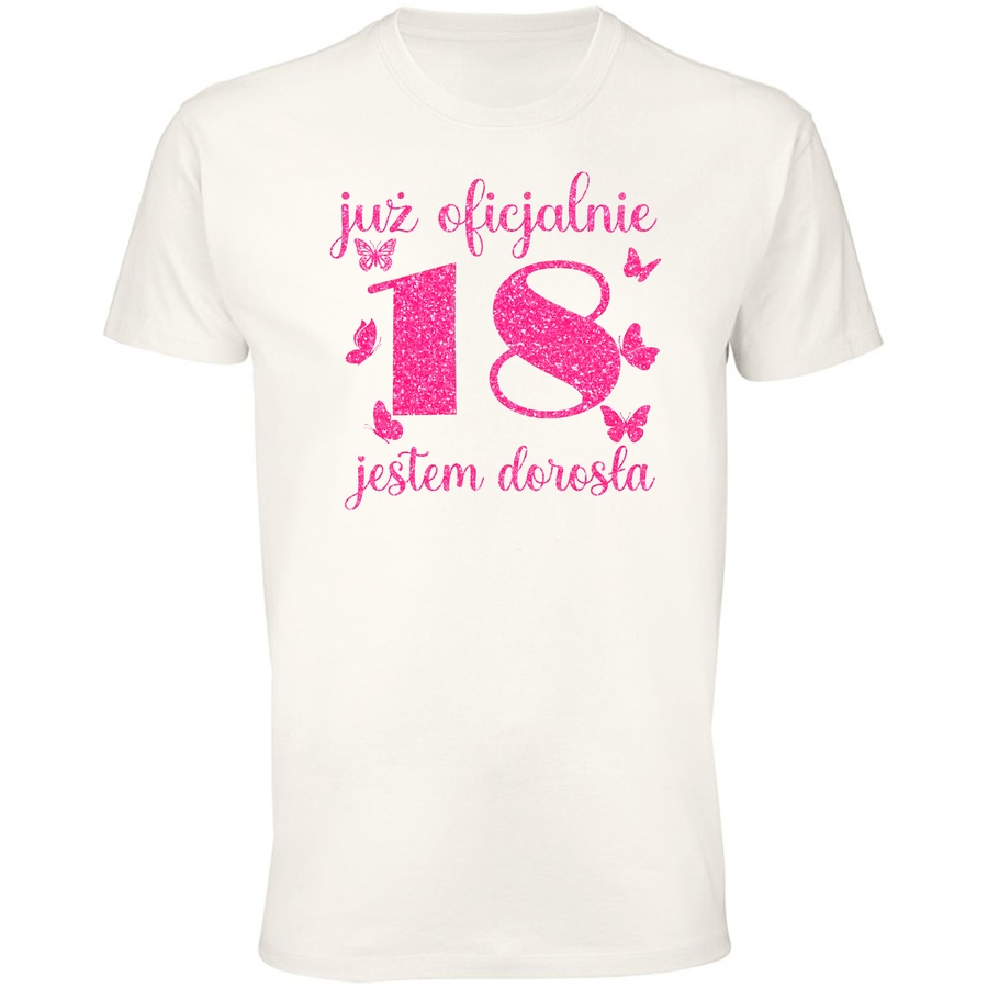 Osiemnastość? Już oficjalnie! Z tej okazji przygotowaliśmy dla Ciebie wyjątkową koszulkę, która pozwoli Ci celebrować ten ważny krok w życiu. Grafika, osadzona w estetyce błyskotek, przyciąga wzrok i emanuje energią młodości. Duże, wyraźne „18” w intensywnym odcieniu różu z efektem brokatu to kwintesencja stylu i pewności siebie. Towarzyszą jej delikatne motyle, które dodają grafice lekkości i subtelności. Doskonały wybór na urodziny, imprezę z przyjaciółmi lub po prostu, aby pokazać światu, że jesteś gotowa na dorosłość! Ta koszulka to idealny sposób na wyrażenie radości i poczucia własnej wartości. Bądź sobą, bądź wyjątkowa, i świętuj swoje 18. urodziny w wielkim stylu. Postaw na wygodę i styl – ta koszulka jest stworzona, abyś czuła się komfortowo i wyglądała olśniewająco.