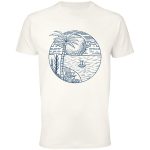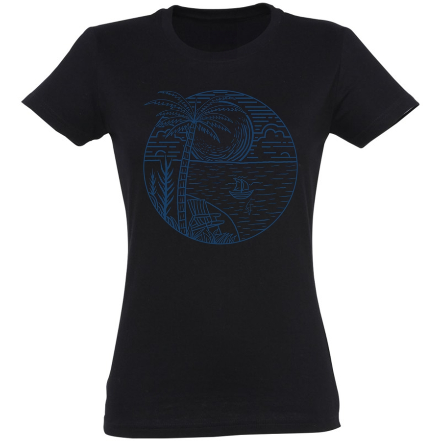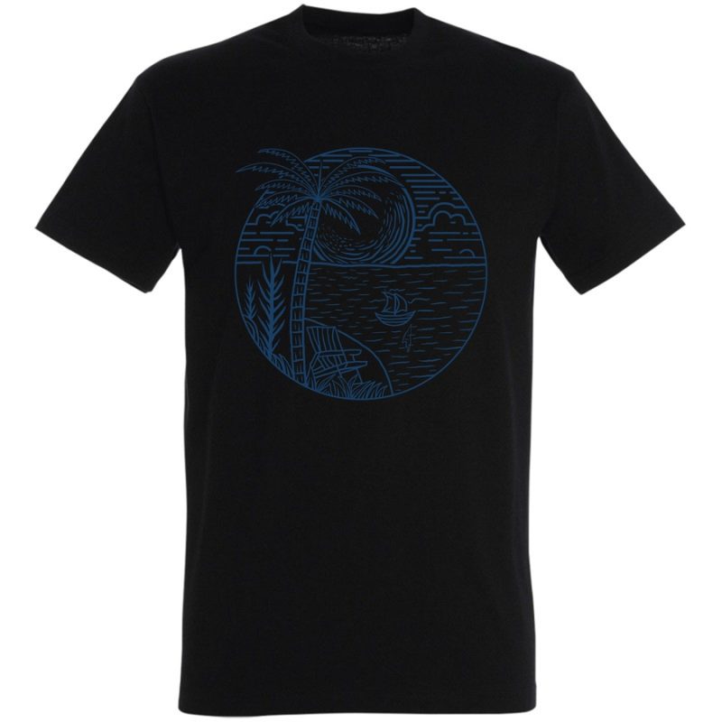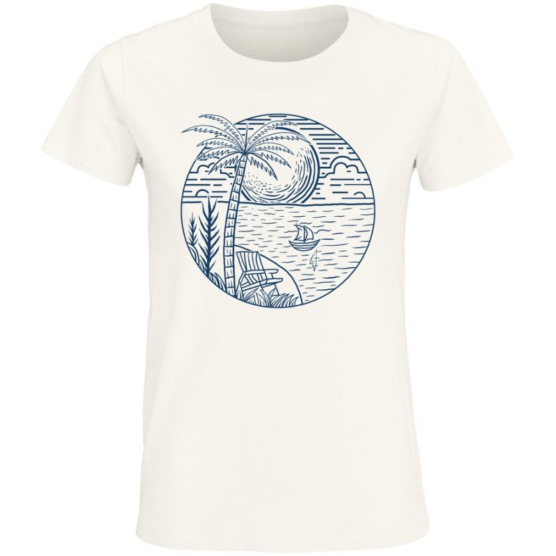 Ucieknij od codzienności i zanurz się w wakacyjnym raju z naszą nową koszulką! Minimalistyczna, graficzna ilustracja w stylu retro przeniesie Cię na egzotyczną plażę. Widzimy tu stylizowaną palmę, falujące morze, malutką żaglówkę i leżak – wszystko to zamknięte w okręgu, który symbolizuje słońce i beztroskie lato. Ta koszulka to idealny sposób na wyrażenie swojego zamiłowania do podróży i relaksu. Wykonana z miękkiej, wysokiej jakości bawełny, zapewni Ci komfort noszenia przez cały dzień.