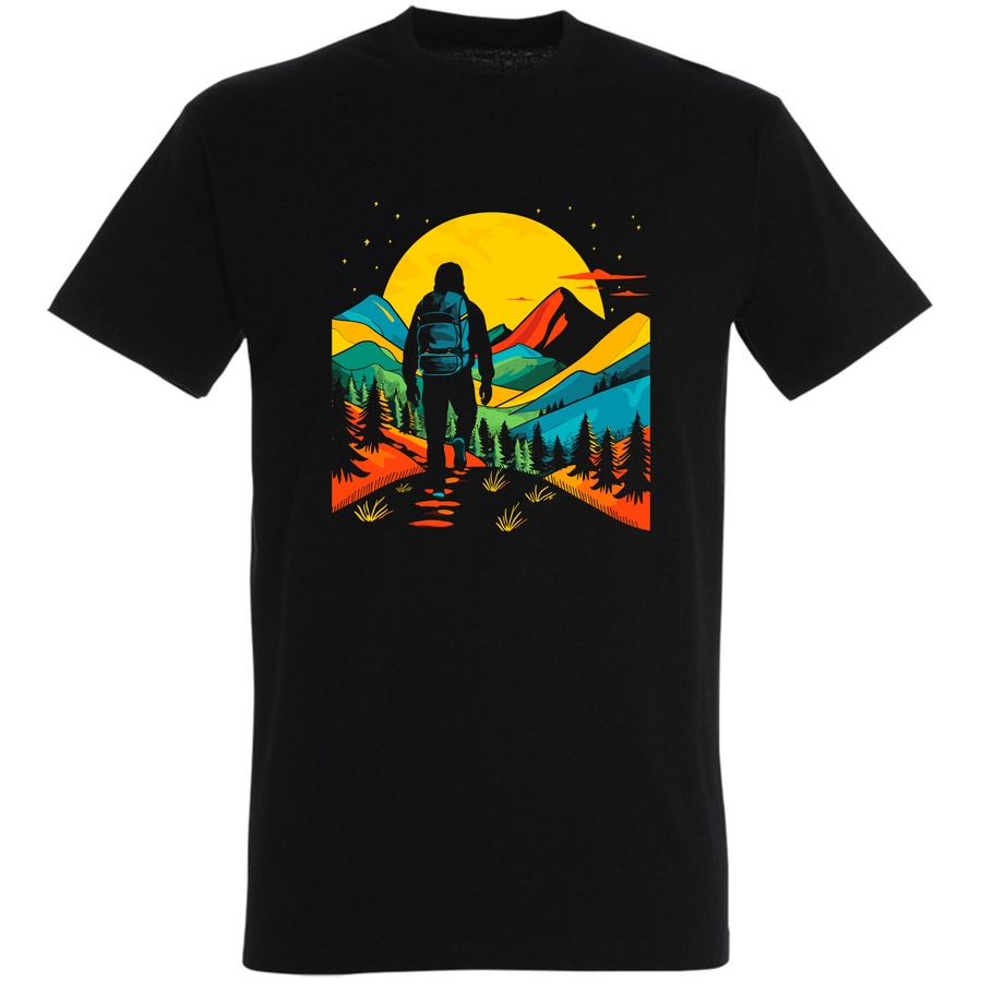 Odkryj w sobie ducha podróżnika z naszą nową koszulką! Ta wyjątkowa grafika przeniesie Cię wprost na szlak górski, nawet jeśli spędzasz dzień w mieście. Siluetka wędrowca, zdeterminowanego i gotowego na przygodę, kontrastuje z oszałamiającym tłem górskim, przedstawionym w unikalnej, geometrycznej stylizacji. Bogactwo barw – od głębokich błękitów i zieleni po ogniste pomarańcze i czerwienie – sprawia, że koszulka przyciąga wzrok i wyraża Twoją pasję do odkrywania.