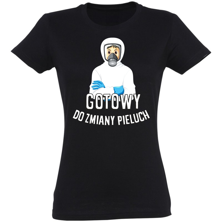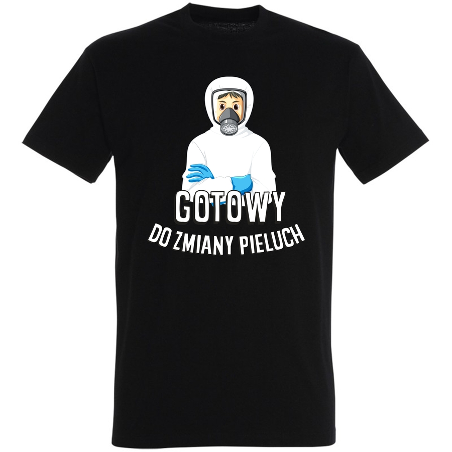 Pozwól, że przedstawimy Ci koszulkę, która łączy w sobie humor i odrobinę absurdu! Grafika przedstawia postać w kombinezonie ochronnym i maseczce, wywołując uśmiech na twarzy. Pod postacią widnieje napis „GOTOWY DO ZMIANY PIELUCH” – idealny dla rodziców w stanie ciągłej gotowości! To idealny prezent dla każdego, kto uwielbia dystans do siebie i nie boi się pokazywać swojego poczucia humoru.
