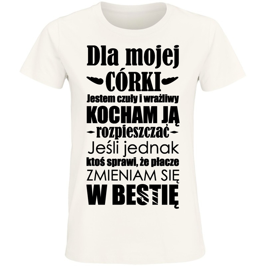 Pokaż światu swoją wrażliwość i bezgraniczną miłość! Ta wyjątkowa koszulka to hołd dla wszystkich czułych i wrażliwych serc, a szczególnie dla naszych ukochanych córek. Wykonana z dbałością o szczegóły, grafika w stylu vintage, odświeżona nowoczesną czcionką, emanuje ciepłem i autentycznością. „Dla mojej córki” – te słowa na zawsze powinny być blisko serca. A co, jeśli ktoś odważy się kwestionować Twoją wrażliwość? „Jeśli jednak ktoś sprawi, że płaczę, ZMIENIAM SIĘ W BESTIĘ!” – to hasło na koszulce to odważne i zabawne ostrzeżenie dla wszystkich, którzy próbują Cię zranić. Ta koszulka to idealny prezent dla Twojej córki, wnuczki, siostrzenicy – dla każdej dziewczyny, która ma w sobie odwagę być sobą.