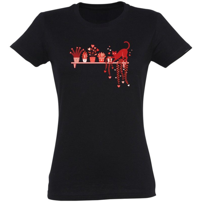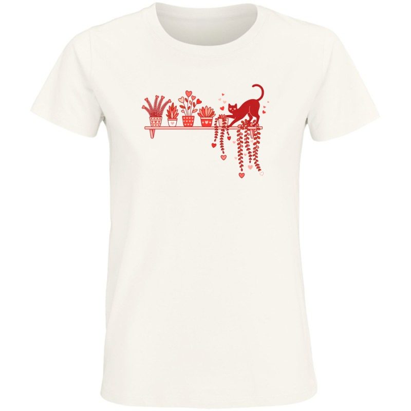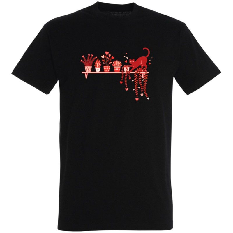 Zanurz się w atmosferę domowego ciepła i radości z naszą nową koszulką! Projekt graficzny to urocza, ręcznie rysowana ilustracja, która łączy w sobie elementy natury i kociego uroku. Widzimy tu stylową półkę, na której stoją doniczki z pięknymi roślinami – od pulchnych sukulentów po kwitnące kwiaty. A co za towarzystwo! Czarujący, czerwony kotek z figlarnym uśmiechem wylewa swoje figle, wplątując się w roślinne dekoracje.