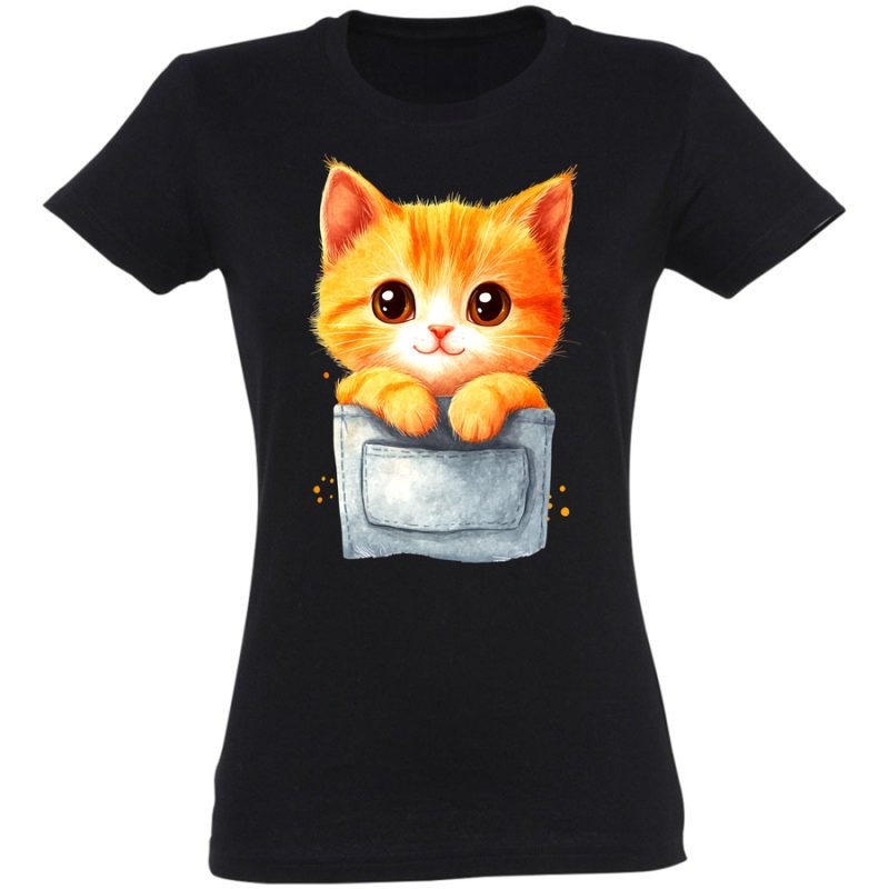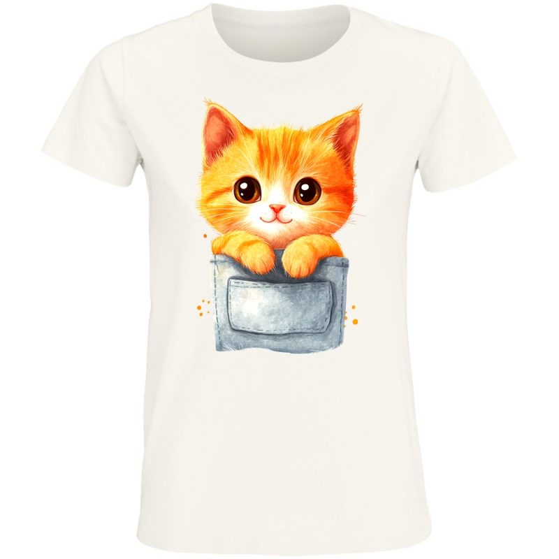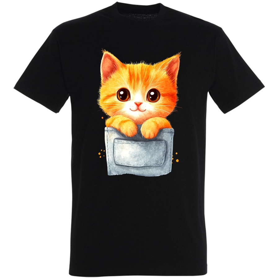 Poznaj uroczą koszulkę z naszym małym, radosnym kociakiem! Ta grafika to kwintesencja słodkości i pozytywnej energii. Widzimy tu sympatycznego, rudego kociaka, który wygląda, jakby właśnie wyskoczył z kieszeni dżinsów – a może to kieszeń wyskoczyła z kociaka? Niezależnie od tego, ten uroczy motyw na pewno rozpromieni każdego!