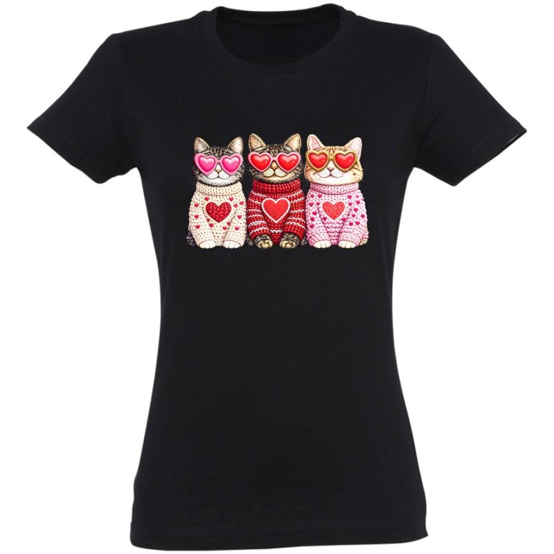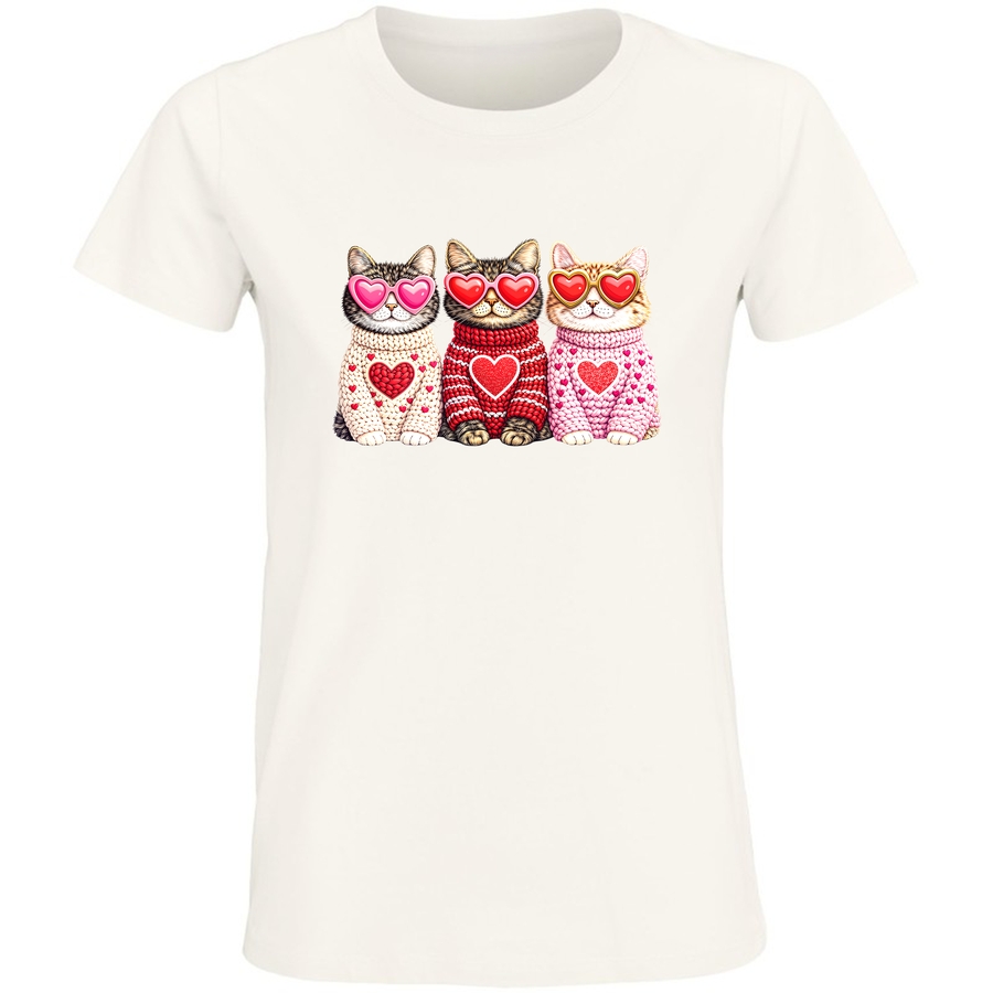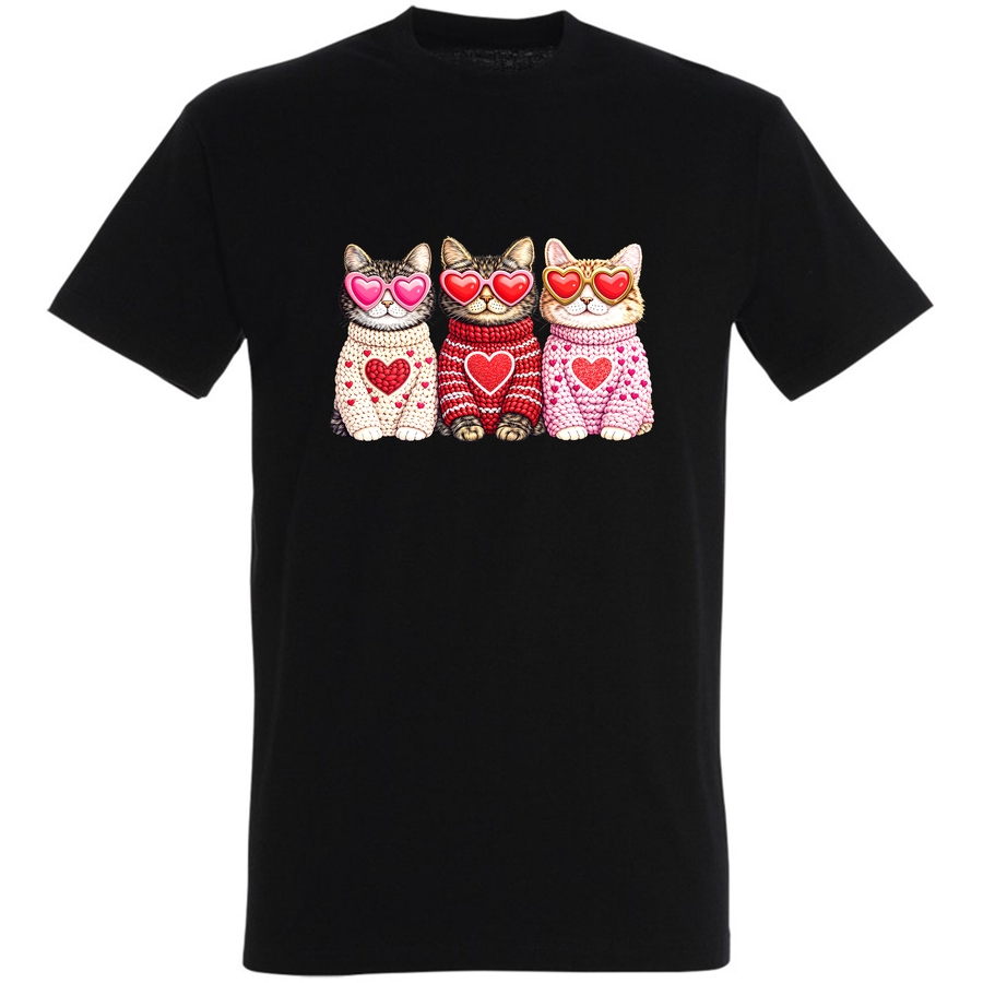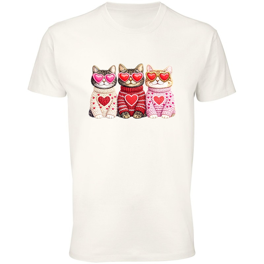 Poczuj się kochany i wyraź swoje funky vibes z naszą absolutnie uroczą koszulką! Na grafice zobaczymy grupę trójki słodkich kotów w okularach przeciwsłonecznych w kształcie serca, uroczo zawiniętych w wełniane sweterki, ozdobione sercami. To idealny sposób na pokazanie swojego miłosnego charakteru i dodanie odrobiny uroku do każdego dnia.