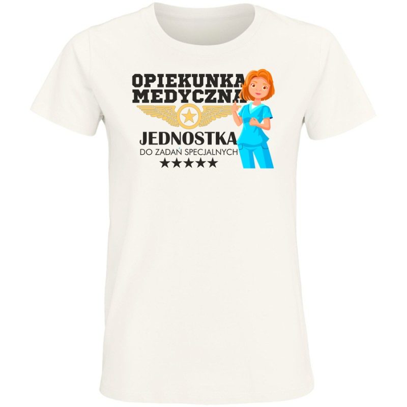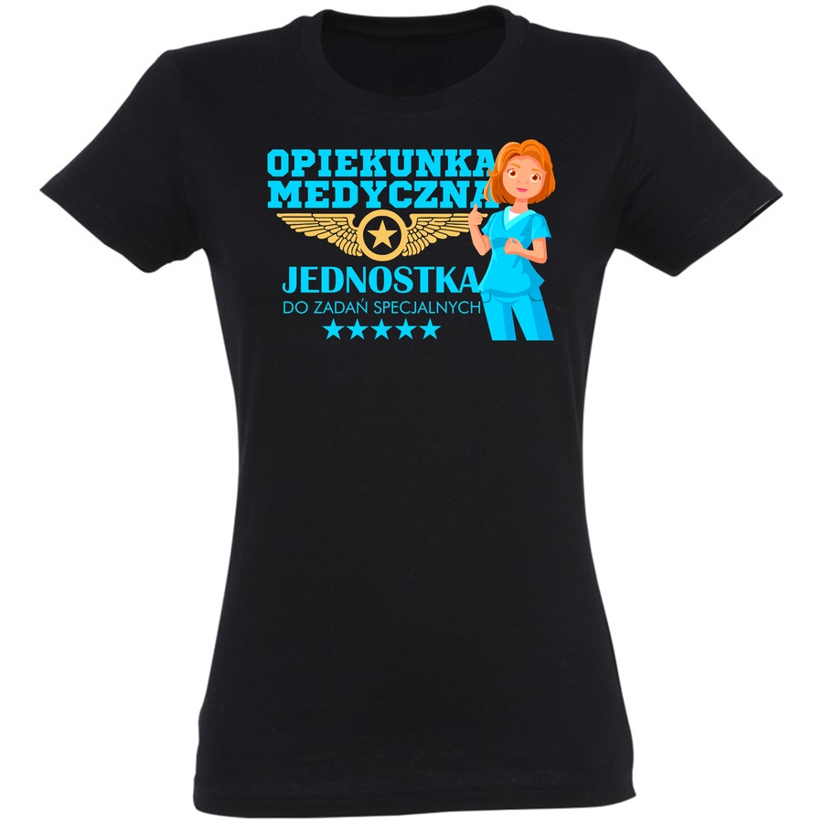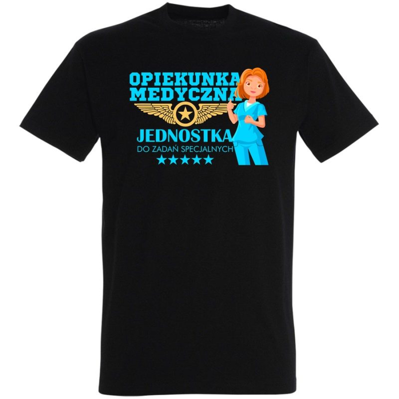 Przedstawiamy koszulkę, która łączy w sobie humor i szacunek dla tych, którzy każdego dnia ratują życie! Ta wyjątkowa grafika to hołd dla pielęgniarek i opiekunek medycznych – prawdziwych „Jednostek do Zadań Specjalnych”! Widzisz tu uśmiechniętą postać w fartuchu, otoczoną aureolą i skrzydłami – symbol anioła stróża, który troszczy się o zdrowie i dobre samopoczucie. Duży, wyrazisty napis „OPIEKUNKA MEDYCZNA” w połączeniu z hasłem „DO ZADAŃ SPECJALNYCH” podkreśla wyjątkowość i zaangażowanie tych niezwykłych osób. Na dole grafiki znajduje się seria gwiazdek, symbolizujących doskonałość i poświęcenie.