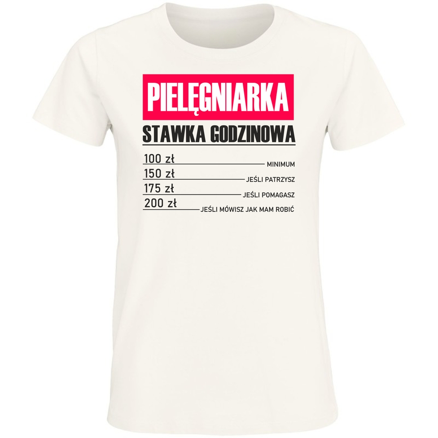 Zdobądź koszulkę, która mówi sama za siebie! Ta wyjątkowa grafika w stylu retro, z wyraźnymi, grubymi liniami i klasyczną kolorystyką, to idealny sposób na wyrażenie swojego poczucia humoru i charakteru. „Pielęgniarka” i „Stawka Godzinowa” – to hasło, które od razu przyciąga uwagę i wywołuje uśmiech na twarzy. Całość dopełniają cenowe propozycje, dodające koszulce autentycznego, vintage’owego klimatu. Niezależnie od tego, czy jesteś pielęgniarką, a może po prostu doceniasz ten zawód i lubisz oryginalne gadżety, ta koszulka musi być Twoja! Idealna na prezent dla bliskiej osoby, na codzienne noszenie lub na specjalne okazje. Pokaż, że masz klasę i poczucie humoru! Ta koszulka to gwarancja pozytywnego nastawienia i oryginalnego stylu. Dodaj ją do swojej garderoby i poczuj się wyjątkowo!