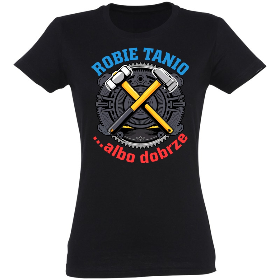 Poczuj moc i styl z naszą nową koszulką! Grafika to prawdziwy hołd dla pasjonatów rękodzieła i tych, którzy cenią sobie solidność i charakter. Widzimy na niej dynamiczną kompozycję dwóch młotków, które krzyżują się na tle stylizowanej tarczy z zębatkami, przypominającej mechanizm. Całość otoczona jest odważnym napisem „ROBIE TANIO” u góry i „albo dobrze” na dole, co dodaje koszulce niepowtarzalny, lekko ironiczny klimat. To idealny wybór dla tych, którzy lubią wyróżnić się z tłumu i pokazać swoją osobowość.