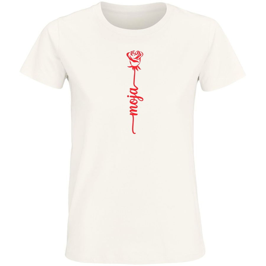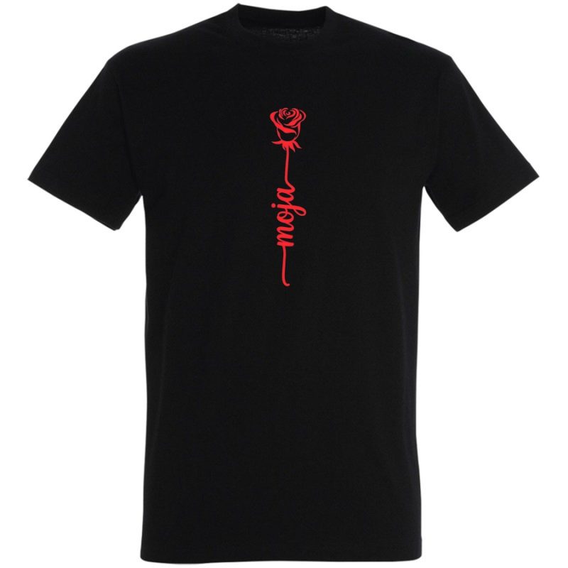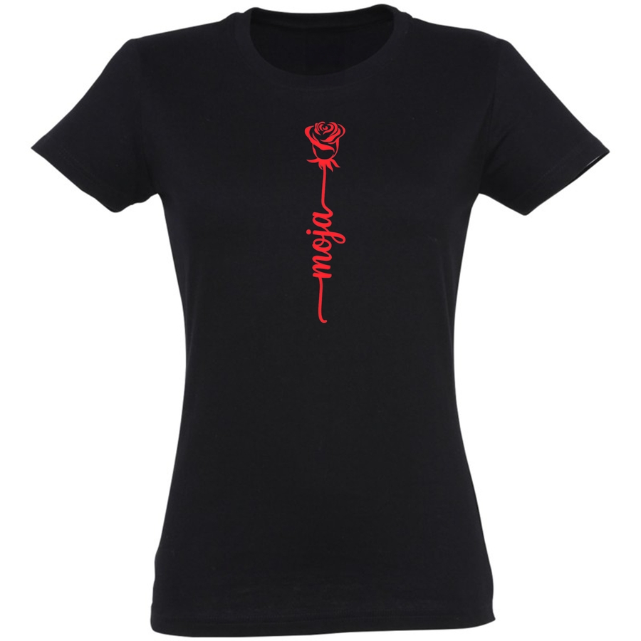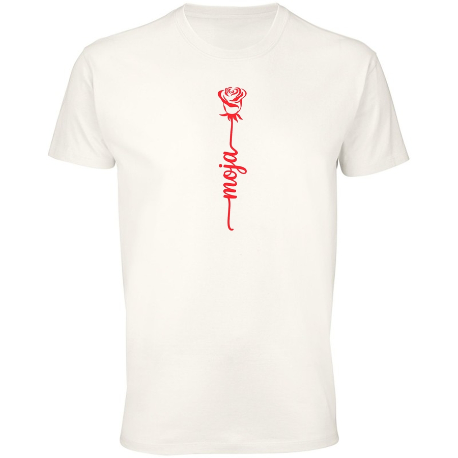 Poczuj magię delikatności i subtelnego piękna z naszą nową koszulką! Centralnym punktem grafiki jest stylizowana, czerwona róża, symbol miłości, pasji i niewinności. Pod różą, w eleganckim, ręcznie pisanym stylu, umieszczony jest napis „moja”. Ta koszulka to idealny sposób na wyrażenie swoich uczuć, niezależnie od okazji.