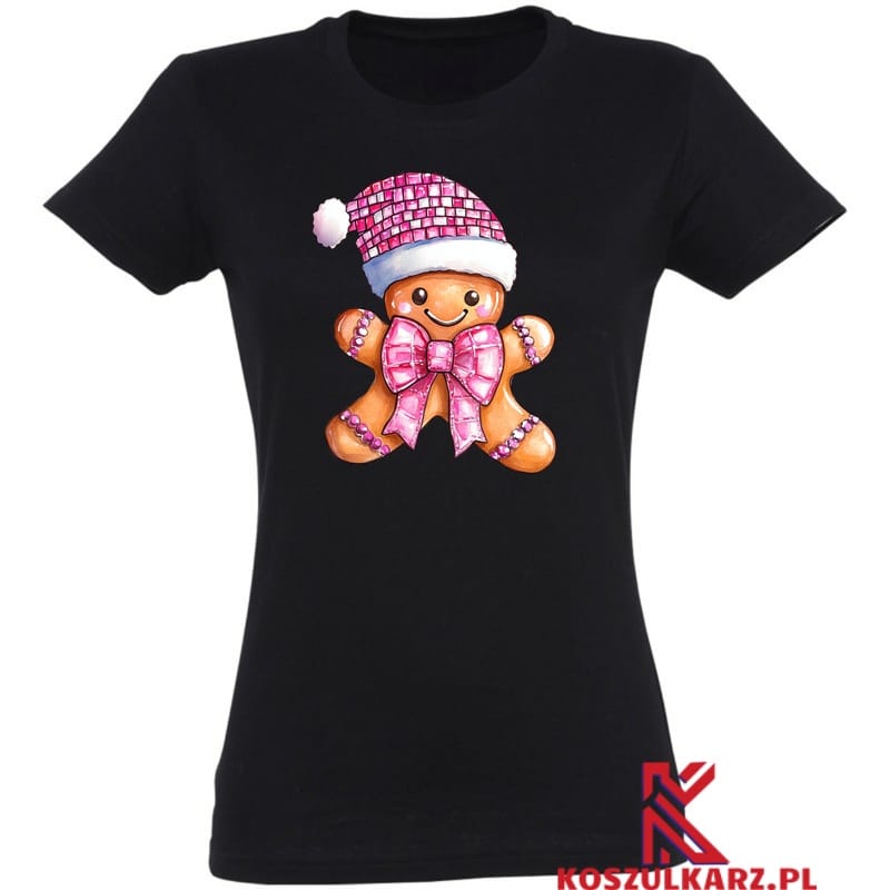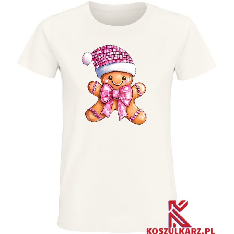 Koszulka z uroczym pierniczkowym człowieczkiem w różowej kokardzie, świątecznej czapce i ozdobnymi detalami to idealna propozycja na Boże Narodzenie. Świąteczny design przyciąga uwagę swoją słodką estetyką i jest świetnym wyborem na przyjęcia, spotkania rodzinne, czy zimowe wyjścia. Słodki Pierniczek To doskonały dodatek do garderoby, który podkreśla radosny nastrój świąt.