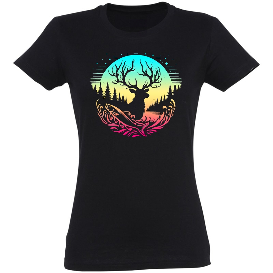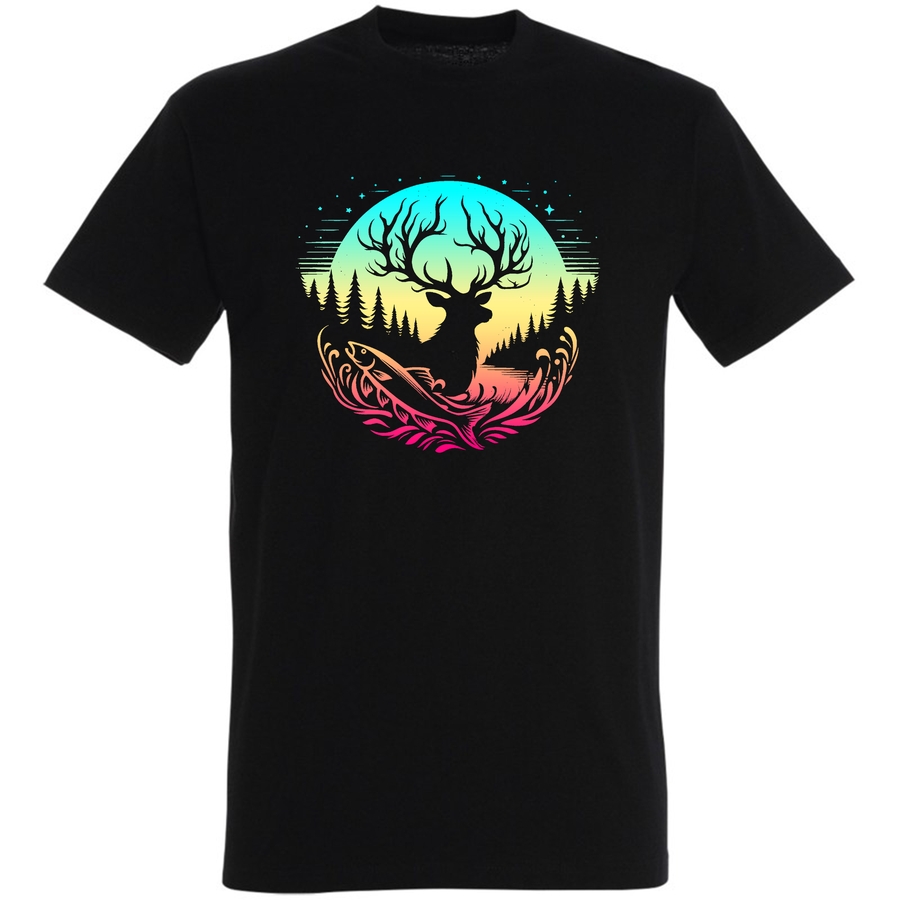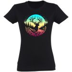Zanurz się w magiczny świat natury z naszą nową koszulką! Projekt graficzny łączy w sobie surową siłę dzikiej przyrody z subtelną estetyką vintage. Centralnym motywem jest majestatyczny łoś, dumnie stojący na tle stylizowanego lasu i wschodu słońca. Całość otacza ornament z motywami roślinnymi, nadając grafice unikalny charakter. Kolorystyka w odcieniach żółci, pomarańczy, błękitu i czerwieni tworzy hipnotyzujący efekt, który przyciąga wzrok. To idealny wybór dla miłośników outdooru, podróży i wszystkiego, co związane z naturą.