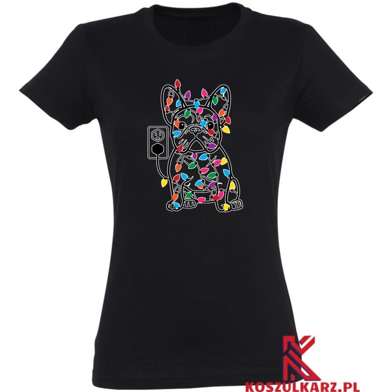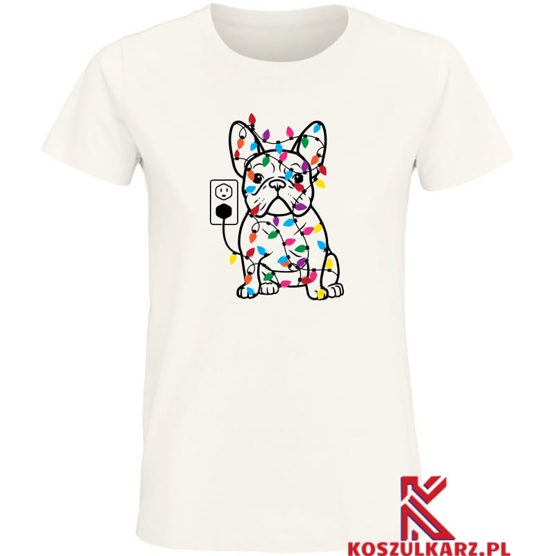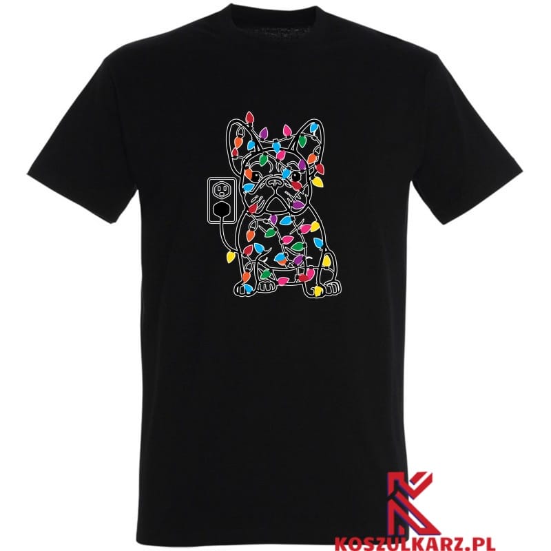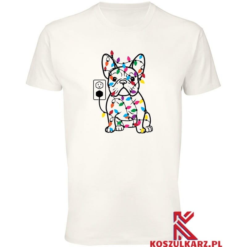 Na tej koszulce znajduje się uroczy buldog francuski, który z humorem wprowadza w świąteczną atmosferę. Otoczony kolorowymi światełkami choinkowymi, wygląda jakby nie do końca rozumiał, co się dzieje – jego zaskoczony, ale zadowolony wyraz pyszczka wywołuje uśmiech na twarzy każdego, kto go zobaczy. Światełka owijające się wokół jego ciała dodają całości świątecznego blasku, a zabawny przewód z wtyczką nadaje ilustracji humorystyczny akcent.
