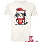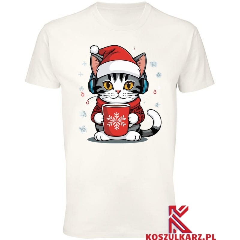 Ta koszulka to idealny wybór dla miłośników kotów i świątecznego nastroju! Przedstawia sympatycznego, domowego kota z charakterystycznymi prążkami na sierści. Kot ma na sobie czerwoną czapkę Mikołaja oraz ciepły, świąteczny sweterek, który podkreśla jego przytulny charakter. W łapkach trzyma kubek z gorącym napojem, ozdobiony wzorem płatka śniegu, co dodaje całości zimowego uroku. Na uszach ma słuchawki, sugerując, że relaksuje się przy ulubionej muzyce. To obraz idealnego sposobu na spędzenie zimowych wieczorów – pełnych ciepła, relaksu i świątecznej magii.