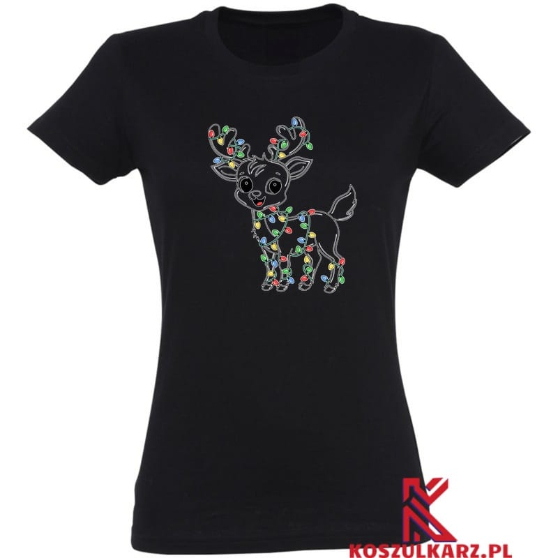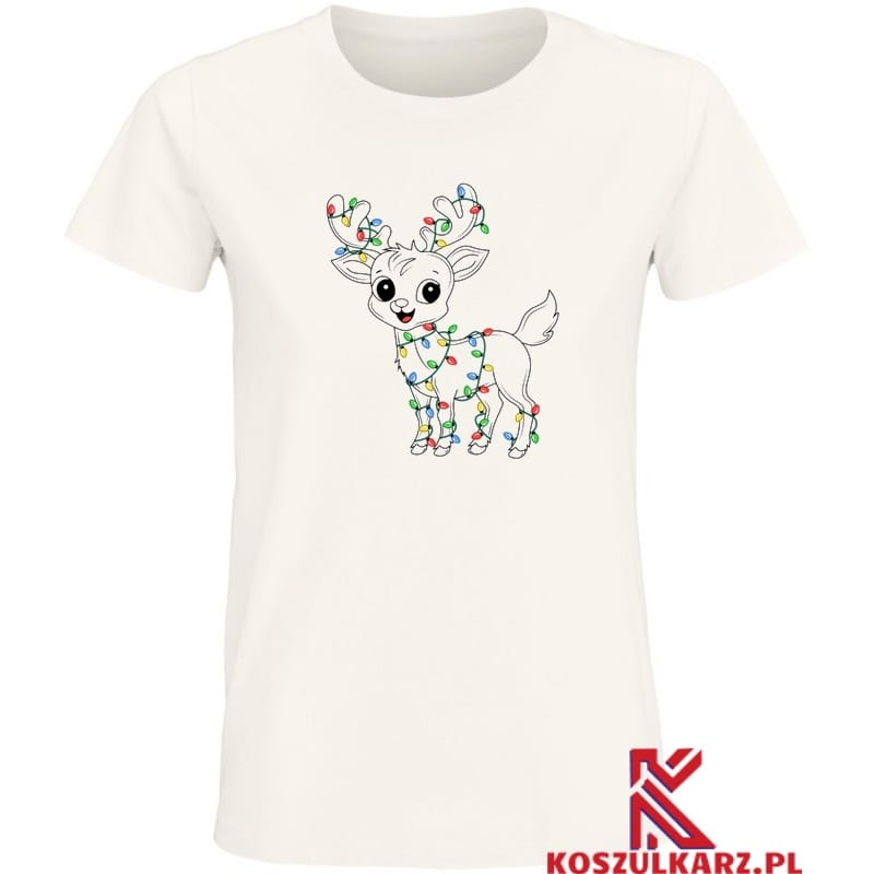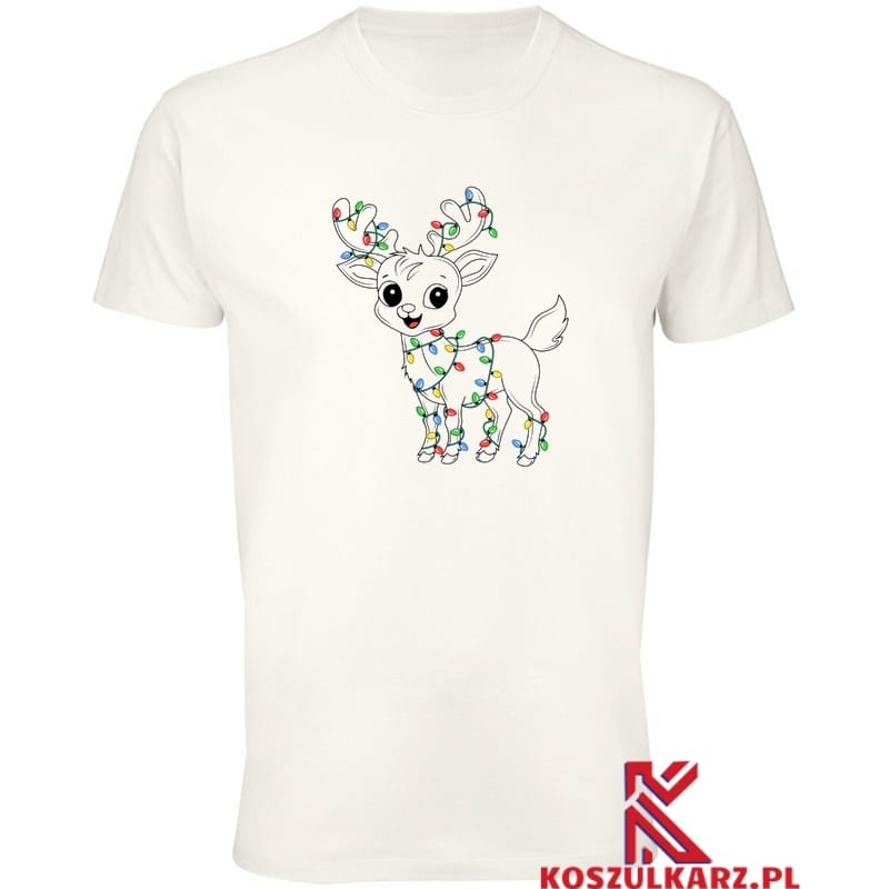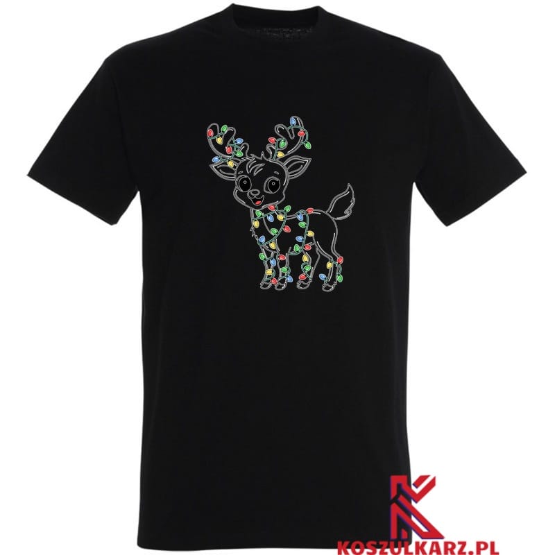 Ta koszulka to idealny wybór dla każdego, kto kocha świąteczną atmosferę! Na przodzie koszulki widnieje uroczy renifer, ozdobiony kolorowymi światełkami choinkowymi, które owijają się wokół jego poroża i ciała. Jego duże, okrągłe oczy i uśmiechnięta buźka dodają całości wyjątkowego, przyjaznego charakteru, sprawiając, że renifer wygląda niezwykle sympatycznie.