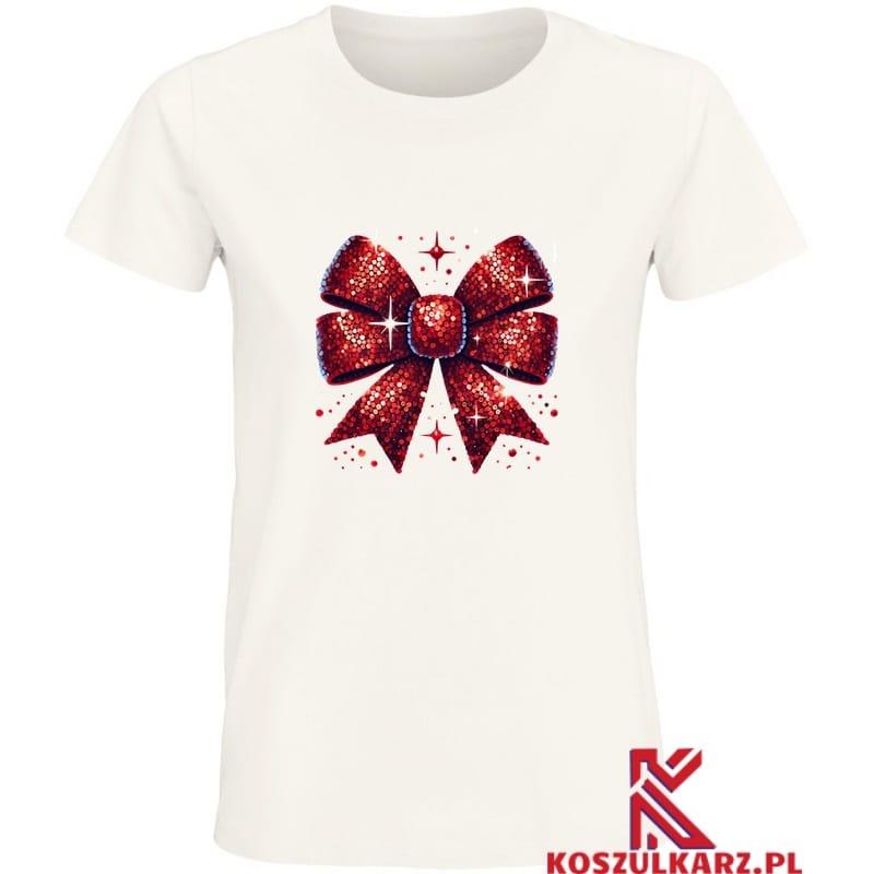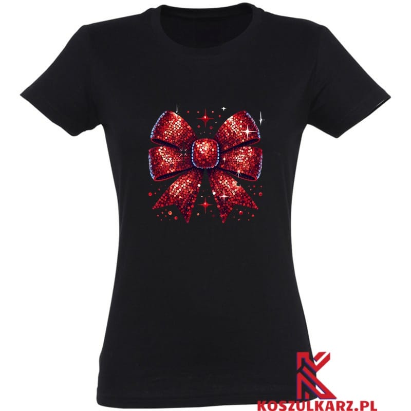 Czerwona kokarda – Odkryj wyjątkowy styl naszej koszulki, która zdobi czerwona kokarda z błyszczącymi elementami, przypominająca świąteczne dekoracje. Ten wzór jest idealny dla każdego, kto chce dodać odrobinę elegancji i świątecznego nastroju do swojej garderoby.