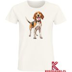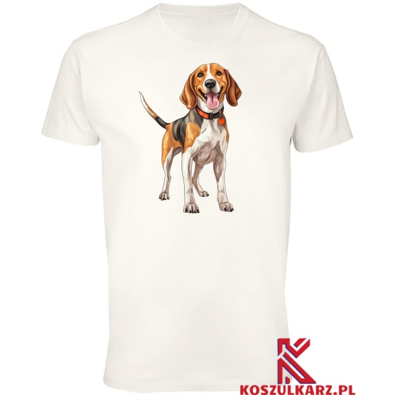 Nadruk na tej koszulce przedstawia English Coonhounda – rasę, która łączy w sobie zwinność, siłę i niesamowite zdolności tropiące. Pies został uchwycony w klasycznej, gotowej do akcji pozycji, z wyrazistymi, alertnymi uszami i skupionym, pełnym determinacji spojrzeniem. Angielski Coonhound to rasa ceniona nie tylko za swoje myśliwskie zdolności, ale także za oddanie i energię, co nadruk doskonale odzwierciedla. Jego szczupła sylwetka i muskulatura zostały precyzyjnie odwzorowane, podkreślając cechy tej wytrzymałej rasy.