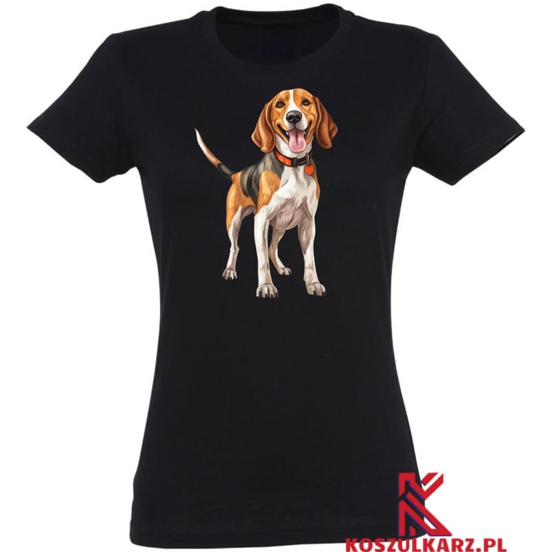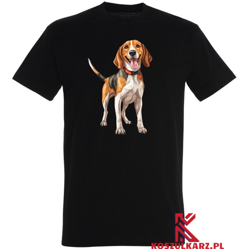 Grafika English Coonhounda została stworzona z myślą o zachowaniu każdego szczegółu. Od jego długich, opadających uszu, po charakterystyczne, mocne łapy – wszystko to jest uchwycone w realistycznym stylu. Nadruk, wykonany za pomocą nowoczesnej technologii druku cyfrowego, prezentuje się niezwykle ostro i wyraźnie, co sprawia, że każdy element wizerunku psa wyróżnia się na tle koszulki. Kontrast między trójkolorową sierścią Coonhounda a tłem koszulki (białym lub czarnym) tworzy harmonijną, stylową całość.