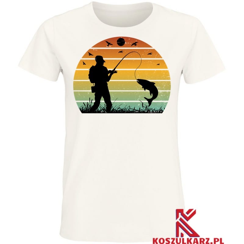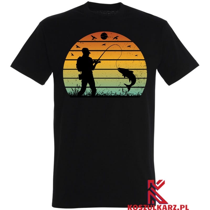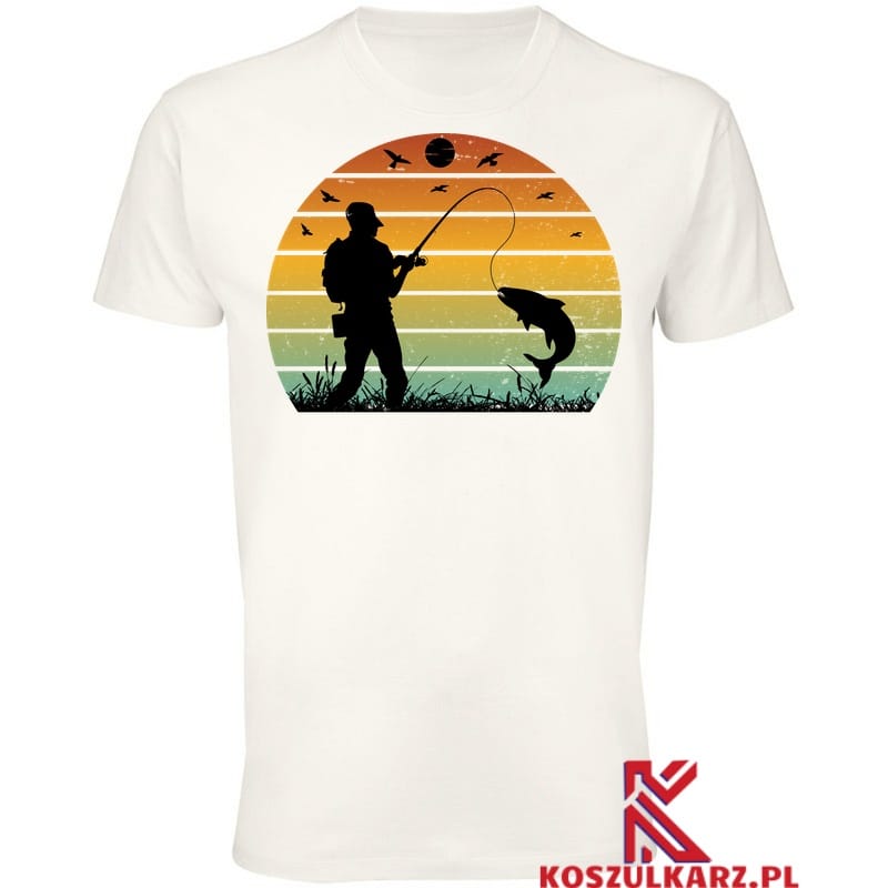Motyw na koszulce przedstawia wędkarza w klasycznej pozie, otoczonego pięknymi krajobrazami. Stylizowany na retro, nadruk oddaje sielski klimat porannego połowu ryb, kiedy cisza i spokój otaczają wędkarza, a natura budzi się do życia. To idealna koszulka dla każdego, kto kocha wędkowanie i chce wyrazić swoją pasję.