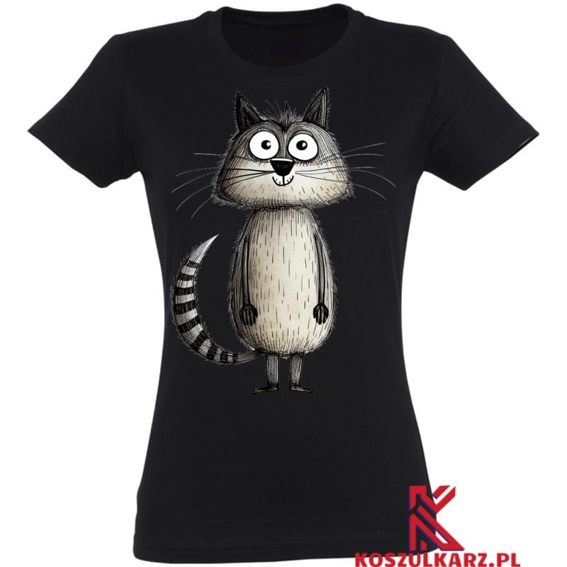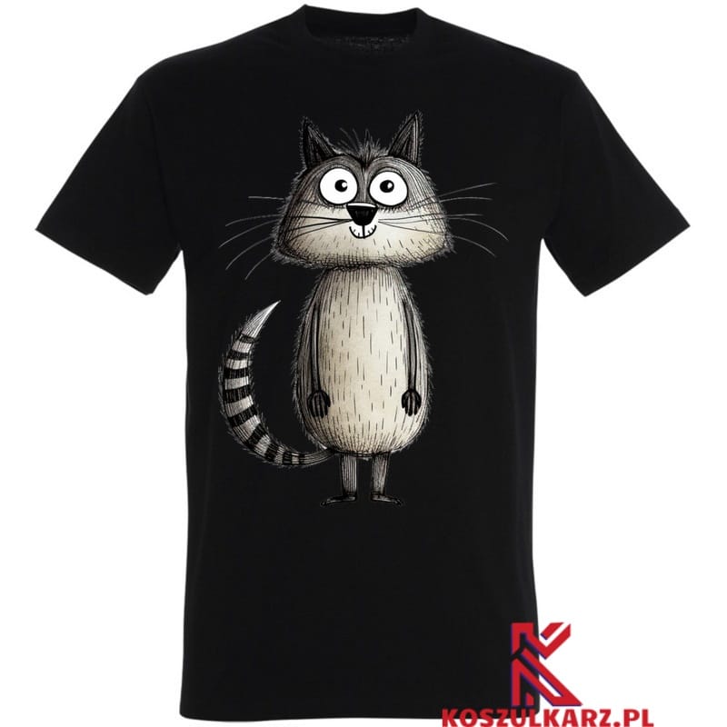 Rysunkowy szary kot w sympatycznej pozie emanuje ciepłem i przyjaznym duchem. To świetny sposób na wyrażenie swojej miłości do kotów oraz indywidualności, czyniąc tę koszulkę doskonałym elementem codziennych outfitów.