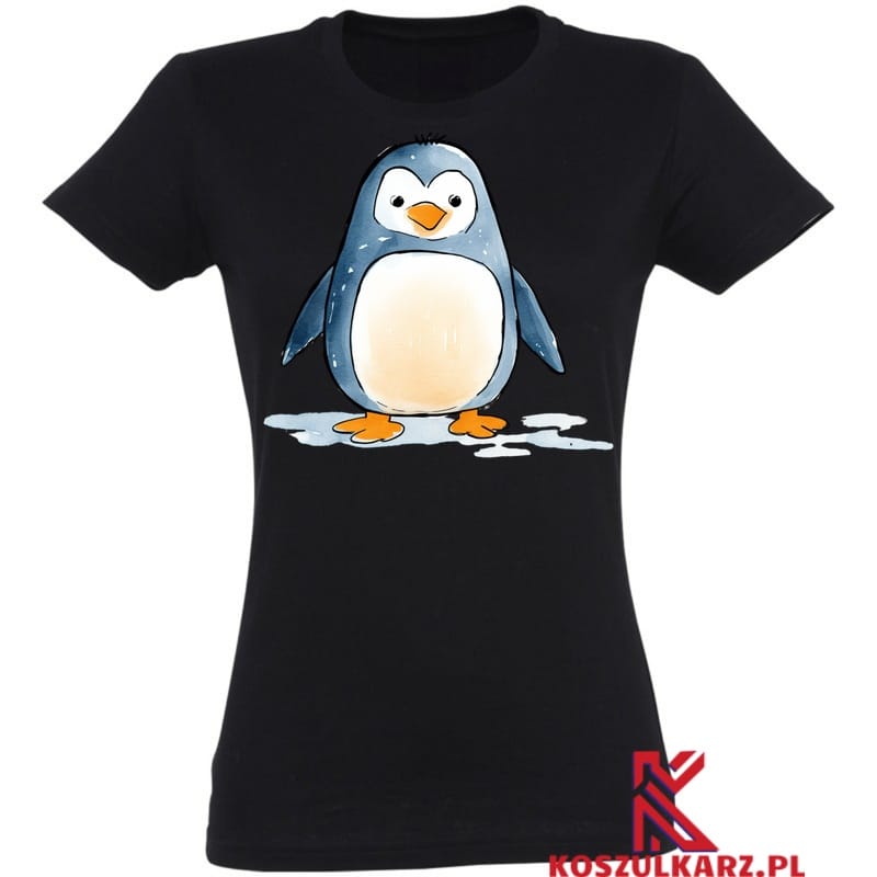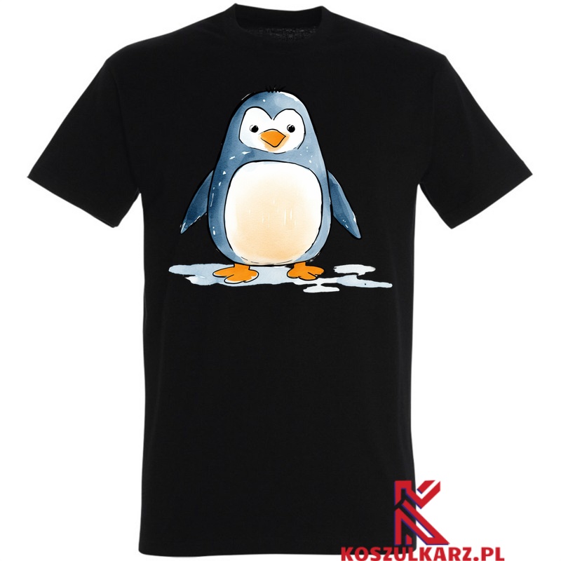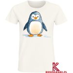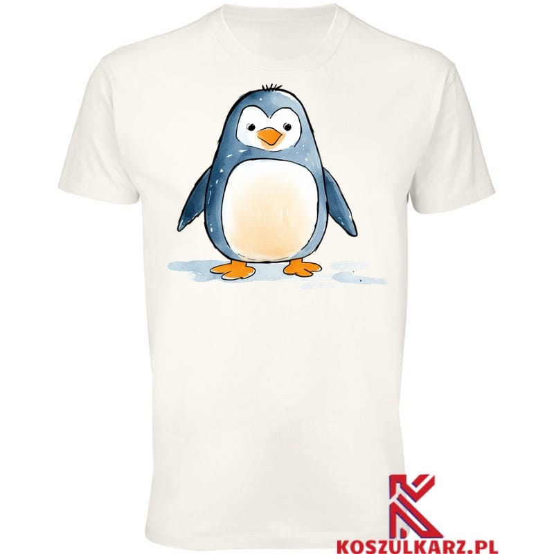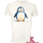 Grafika przedstawiająca pingwina w stylu rysunkowym ukazuje jego charakterystyczny wygląd i uroczą osobowość. Koszulka doskonale komponuje się z różnymi stylizacjami, od casualowych po sportowe, dodając charakteru każdemu outfitowi.