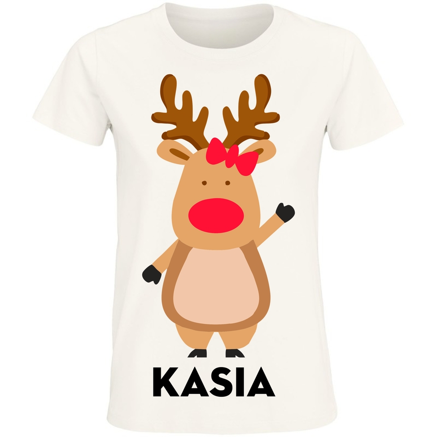 Przygotuj się na odrobinę uroku i świątecznego klimatu z naszą najnowszą koszulką! Projekt graficzny łączy w sobie prostotę i słodkość – przedstawia uroczy renifera z czerwonym nosem i stylową, różową kokardką. Pod reniferem widnieje imię „Kasia”, dodając koszulce osobisty charakter. Ta koszulka to idealny wybór dla wszystkich, którzy chcą dodać odrobinę luzu i dobrego humoru do swojej garderoby.