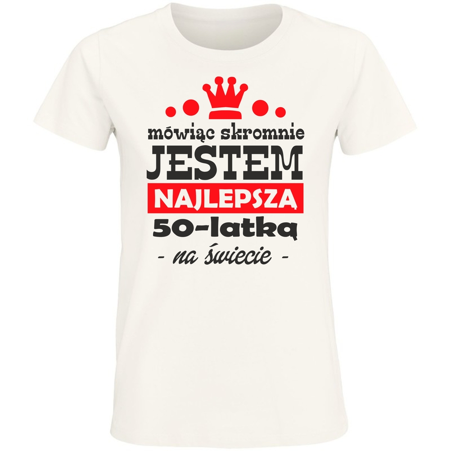 Poczuj się wyjątkowa i błyszcząca w naszej koszulce z odważnym przesłaniem! Ta koszulka to idealny sposób, by wyrazić swoją pewność siebie i poczucie humoru. Styl grafiki łączy w sobie elementy retro i nowoczesności, tworząc unikatowy design, który przyciąga wzrok. Duże, czytelne napisy – „mówiąc skromnie”, „NAJLEPSZA 50-latka” i „na świecie” – są odważnym akcentem, który z pewnością wywoła uśmiech i pozytywne komentarze. Królewski detal – korona – dodaje grafice subtelnego charakteru i podkreśla wyjątkowość noszącej.
