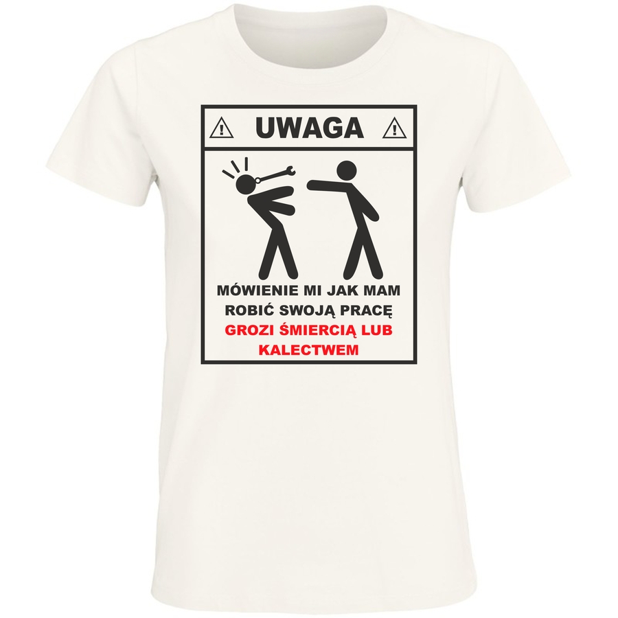 Pokaż światu, że wiesz, co robisz! Nasza unikatowa koszulka z motywem „Mówienie mi jak mam robić swoją pracę grozi śmiercią lub kalectwem” to idealny sposób na wyrażenie swojego niezależnego ducha i poczucia humoru. Grafika w stylu ostrzegawczego znaku, z dynamiczną sylwetką człowieka trzymającego narzędzie, przyciąga wzrok i budzi uśmiech. To doskonały wybór dla każdego, kto ceni sobie wolność działania i nie boi się wyrażać swojego zdania. Niezależnie od tego, czy jesteś mechanikiem, artystą, czy po prostu osobą z silnym charakterem, ta koszulka podkreśli Twoją indywidualność. Wyobraź sobie reakcje znajomych i współpracowników – z pewnością nie pozostaniesz niezauważony! Ta koszulka to nie tylko modny element garderoby, ale też świetny sposób na rozpoczęcie rozmowy i pokazanie swojego poczucia dystansu do siebie. Została zaprojektowana dla tych, którzy lubią łamać konwencje i bawić się językiem. To idealny prezent dla osoby, która ceni sobie humor i nie boi się wyrażać swojego zdania. No i jest super wygodna! Ubranie to idealna opcja na co dzień, na spotkania z przyjaciółmi, na trening lub po prostu dla Ciebie.