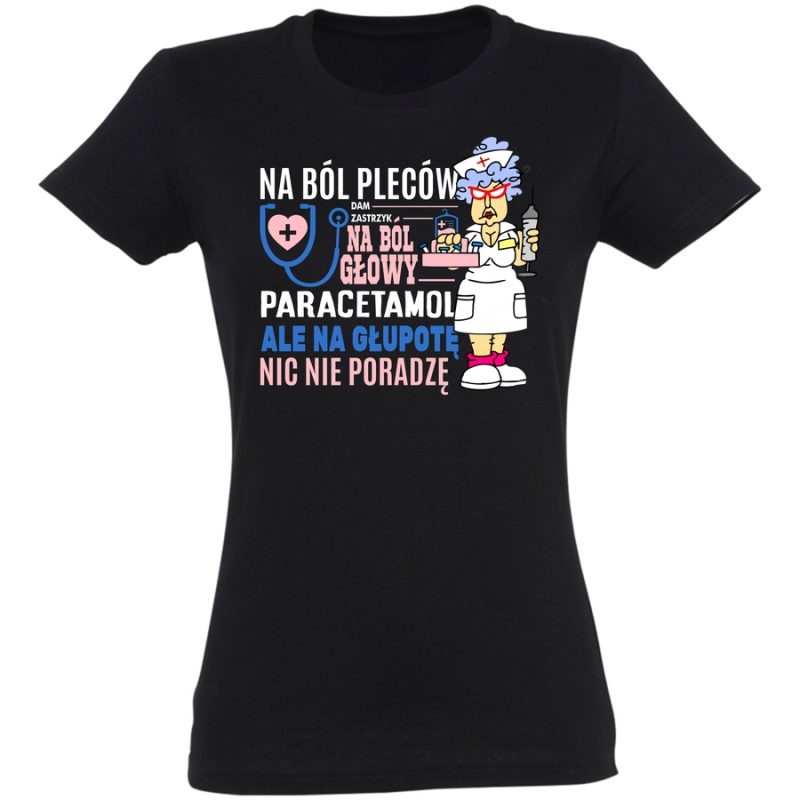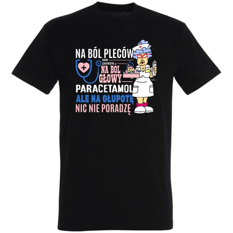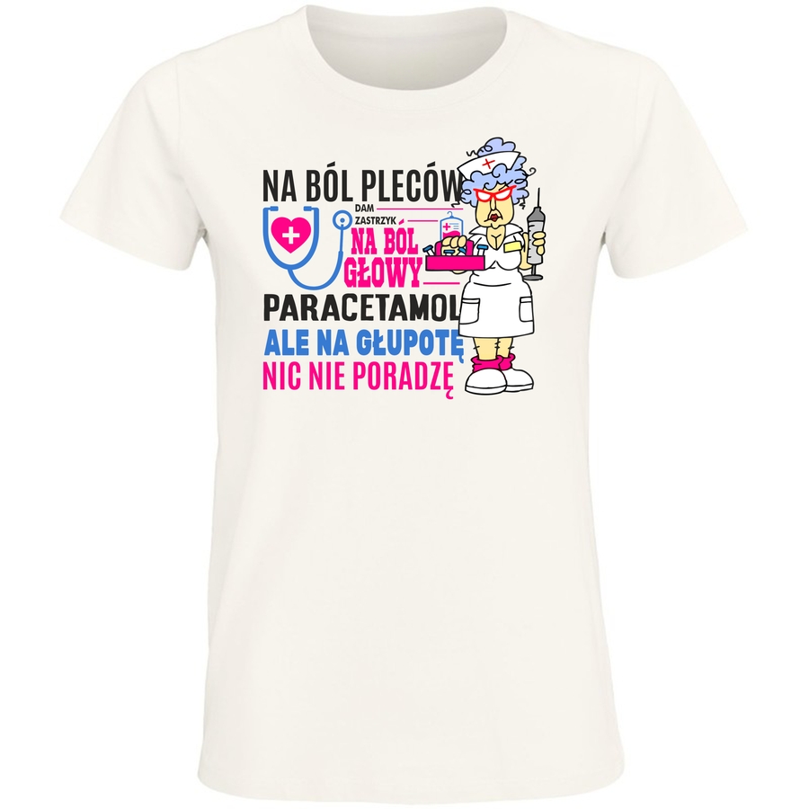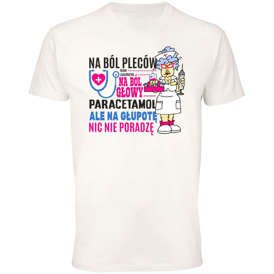 Odkryj koszulkę, która rozbawi i doda Ci luzu! Nasz unikatowy design w stylu retro, z humorystyczną ilustracją pielęgniarki, to idealny sposób, żeby dodać pikanterii do codziennej stylizacji. Wyraź swój charakter i poczucie humoru z odrobiną retro uroku! Grafika w stylu komiksowym z zabawnymi hasłami „Na ból pleców”, „Na ból głowy”, „Paracetamol, ale na głupotę nic nie poradzi” gwarantuje mnóstwo pozytywnych reakcji i uśmiechów.