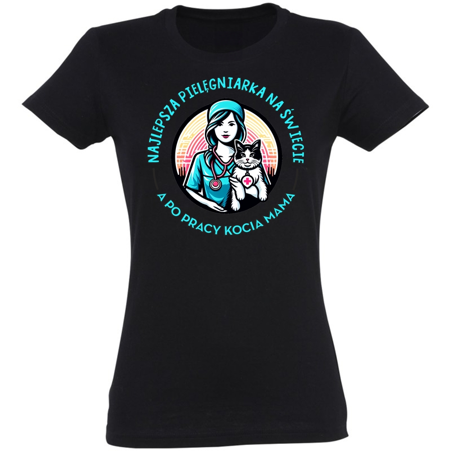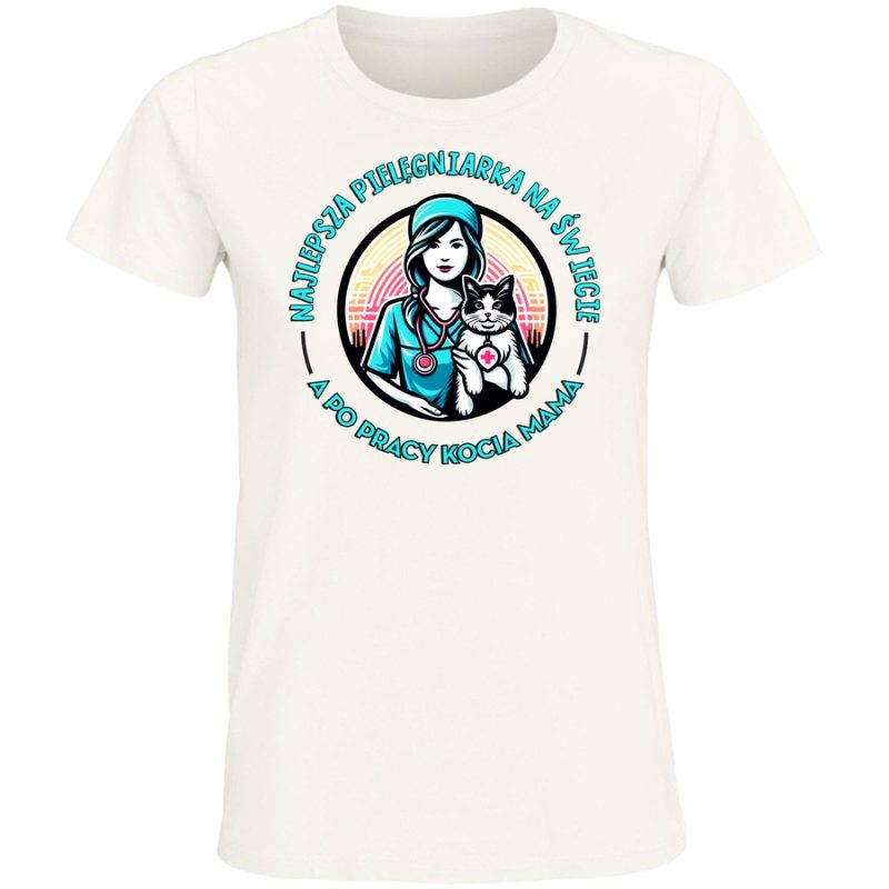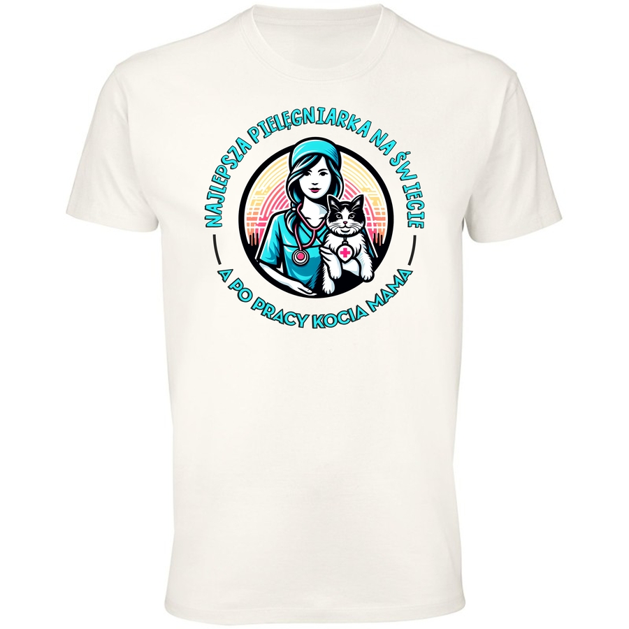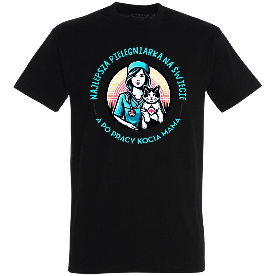 Pokaż światu swoje serce i pasję! Ta wyjątkowa koszulka to hołd dla oddanych pielęgniarek, które każdego dnia dają z siebie wszystko, by troszczyć się o zdrowie i dobre samopoczucie. Grafika w stylu vintage, z uroczym motywem pielęgniarki i jej czworonożnego przyjaciela, emanuje ciepłem i optymizmem. Klasyczny design, z charakterystycznym kapeluszem i wyrazistymi liniami, dodaje koszulce niepowtarzalny styl. Napis „NAJLEPSZA PIELĘGNIARKA NA ŚWIECIE” sprawia, że koszulka staje się idealnym prezentem dla ukochanej pielęgniarki, a dodatek „A PO PRACY KOCIA MAMA” dodaje jej osobisty akcent. Ta koszulka to idealny sposób na wyrażenie wdzięczności i podziwu dla tych wyjątkowych kobiet. Poczuj się pewnie i stylowo, jednocześnie pokazując swoje poczucie humoru! Idealna na codzienne noszenie, spotkania z przyjaciółmi, czy jako oryginalny upominek. Wyraź swój styl i pokaż światu, co naprawdę ważne!