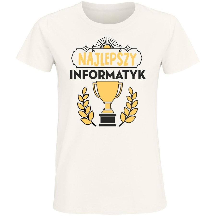 Poznaj koszulkę, która łączy w sobie nutę vintage z nowoczesnym poczuciem humoru! Ta wyjątkowa grafika to hołd dla każdego, kto kocha technologię i lubi się pośmiać. Widzimy tutaj stylizowany napis „NAJLEPSZY” umieszczony na dekoracyjnej, łukowej ramce, a pod nim – „INFORMATYK” – obok stylizowanej, złotej statuetki, symbolizującej sukces i osiągnięcia. To idealny prezent dla informatyka, programisty, studenta IT czy każdego, kto czuje pasję do cyfrowego świata.