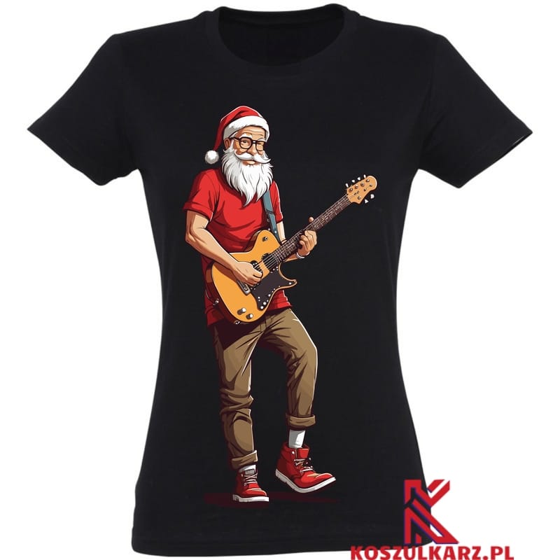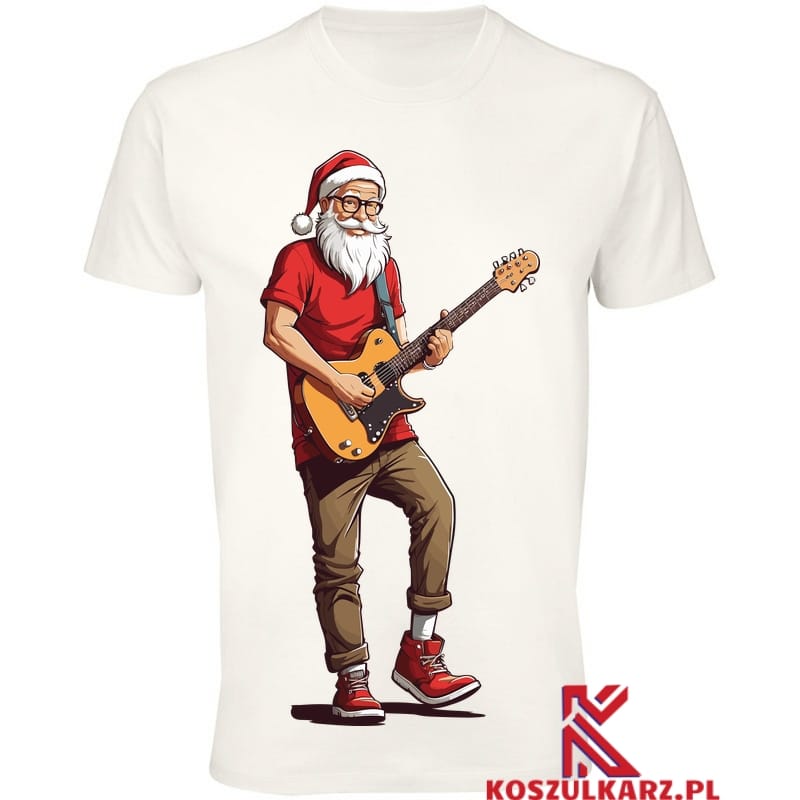 Świąteczne brzmienia w rockowym stylu z Gitarowym Akcentem – Ta koszulka przedstawia Świętego Mikołaja grającego na gitarze, łącząc świąteczny duch z pasją do muzyki. Idealna dla miłośników muzyki i oryginalnych świątecznych motywów.