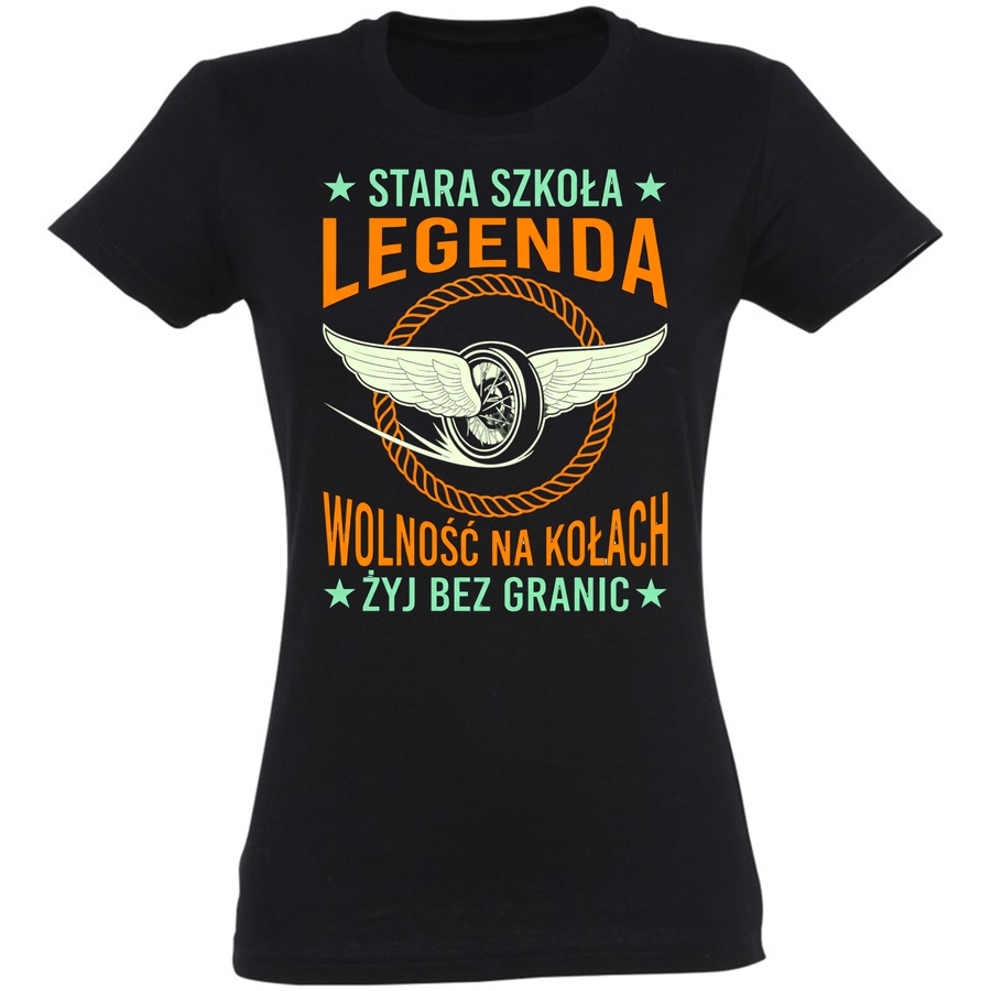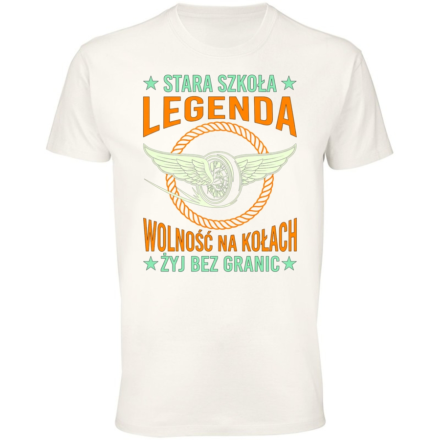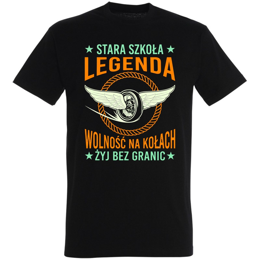 Poczuj wiatr we włosach i smak prawdziwej wolności! Nasza nowa koszulka to hołd dla klasycznych motocykli i ducha przygody. Grafika w stylu retro, nawiązująca do lat 70. i 80., łączy w sobie siłę i styl. Centralnym punktem jest drapieżne, stylizowane koło motocyklowe z majestatycznymi skrzydłami, symbolizujące wolność i szybkość. Pod kołem znajdziesz napis „Wolność na kołach”, a pod spodem „Żyj bez granic”, co idealnie oddaje filozofię prawdziwego motocyklisty.