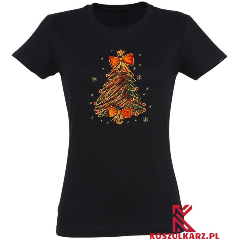 Elegancka choinka Świąteczne Drzewko ozdobiona kokardą – Ta koszulka prezentuje pięknie stylizowane świąteczne drzewko, ozdobione złotymi liniami i przyciągającą wzrok czerwoną kokardą na szczycie. Idealna dla tych, którzy cenią sobie subtelną elegancję w świątecznym okresie.