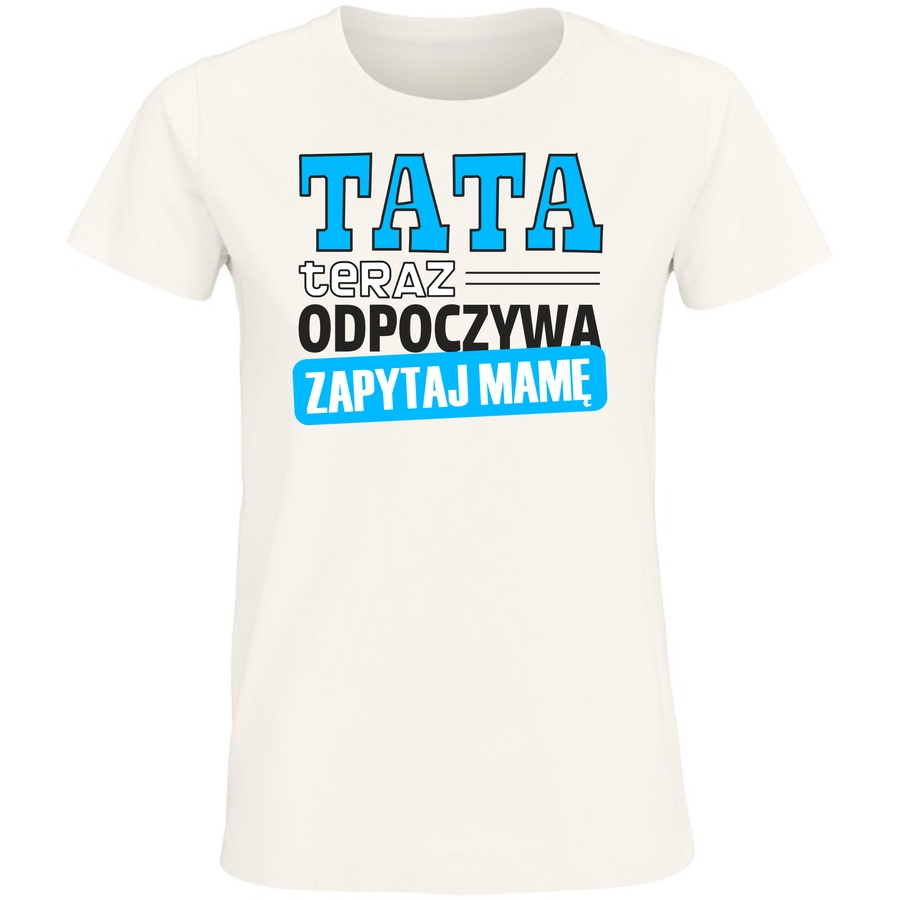 Poczuj klimat lata i beztroskiego relaksu z naszą nową koszulką! Grafika w stylu retro, przywodząca na myśl plakaty z lat 60. i 70., to idealny sposób na wyrażenie swojego luzackiego charakteru. Duże, wyraźne litery „TATA” w jaskrawym błękicie przyciągają wzrok, a pod nimi znajdziemy sentymentalne hasło „TERAZ ODPOCZYWA”. Na dole, z nutką humoru, pojawia się „ZAPYTAM MAMĘ” – idealne dla każdego, kto lubi odrobinę ironii w swoim stylu. Ta koszulka to kwintesencja swobody i dobrego samopoczucia, idealna na weekendowy wypad, spotkanie z przyjaciółmi czy po prostu leniwy dzień w domu. Wyobraź sobie siebie w tej koszulce, delektując się chwilą spokoju i relaksu. Niezależnie od tego, czy jesteś fanem vintage, czy po prostu szukasz oryginalnej i wygodnej koszulki, ta propozycja na pewno Ci się spodoba!