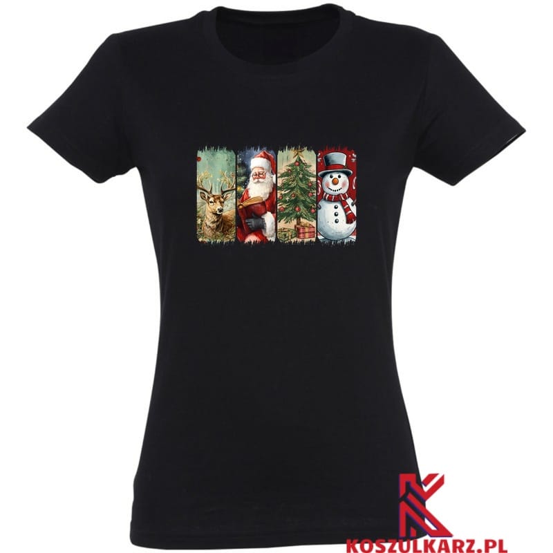 Ta koszulka w stylu vintage, z czterema ikonicznymi motywami – reniferem, Świętym Mikołajem, choinką i bałwanem – to prawdziwy powrót do klasycznych świąt. Każdy z tych symboli został przedstawiony w charakterystycznej, starannie wykonanej grafice, przywołującej na myśl świąteczne ozdoby i dekoracje z dawnych czasów. Vintage Koszulka Świąteczna Czarna tkanina podkreśla intensywność kolorów i sprawia, że nadruk staje się jeszcze bardziej wyrazisty. To idealna koszulka, by wyrazić swoją miłość do tradycji i przywołać na myśl świąteczne wspomnienia.