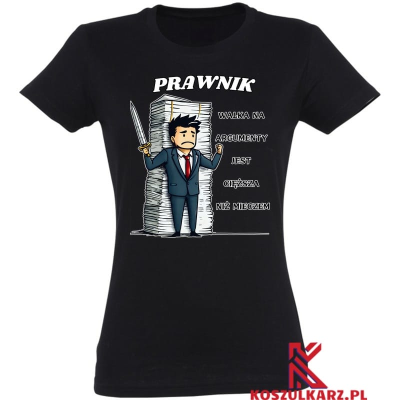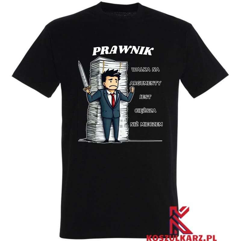 Koszulka „Walka na argumenty jest cięższa niż miecz” to idealny wybór dla każdego prawnika, który doskonale wie, że prawdziwa bitwa toczy się nie w sali sądowej, ale w głowie, gdzie decydujące są słowa, logika i argumenty. Napis na koszulce to żartobliwe przypomnienie o tym, jak ważne i trudne może być skuteczne przekonywanie innych, a czasem żadna siła nie zastąpi dobrze skonstruowanego argumentu. Jeśli jesteś prawnikiem, który nie boi się zmierzyć z wyzwaniami intelektualnymi, ta koszulka będzie idealna.